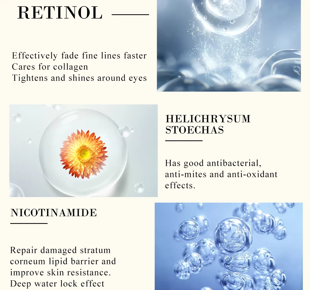 Ретинол-эффективно выцветает тонкие линии быстрее, заботится о коллагене, подтягивает и блестит вокруг глаз.
