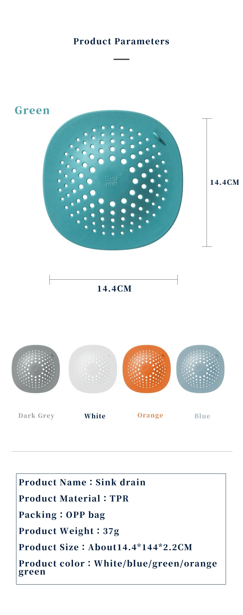 1-Название продукта: слив пола для раковины2-Размеры: Длина 14,5 x Ширина 14,5 см3-Материал: TPR4 цвета: белый/темно-серый/оранжевый/темно-зеленый/синий светильник