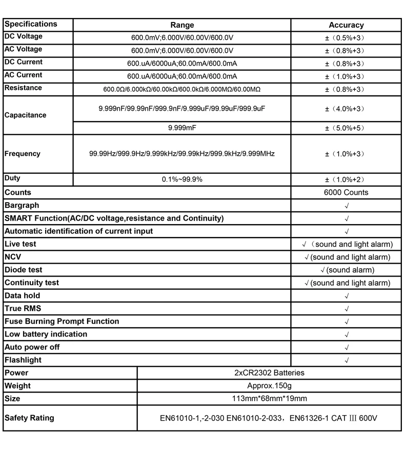 Напряжение постоянного тока: 60 мВ/600 мВ/6 В/60 в/600 В ±(0.5% + 3) Напряжение переменного тока: 60 мВ/600 мВ/6 В/60 в/600 В ±(1.0% + 3) Ток постоянного тока: 6000uA/60mA/600mA ± (1.2% + 5) Ток переменного тока: 6000uA/60mA/600mA ± (1.5% + 5) Сопротивление: 600Ω/6k Ω/60k Ω/600k Ω/6M Ω/60MΩ ± (4.0% + 5) Постоянной ёмкости, универсальный конденсатор: 6nF/60nF/600nF/6 мкФ/60 мкФ/600 мкФ /6mF/60mF ± (4.0% + 5) Частота: 10 Гц/100 Гц/1000 Гц/10 кГц/100 кГц /1000 кГц/10 МГц ± (1.0% + 5) Обязанность: 1% ~ 99% ± (3.0% + 5) Количество: 6000 штук Авто/ручной диапазон: Авто Умная Функция: Да Автоматическое распознавание зонда, вставленного в текущий вход: Да Наконечники взрывателей: Да Функции: Live Test/ NCV/Диодный тест/ Непрерывность/хранение данных/True RMS Индикация низкого заряда батареи: Да Автоматическое выключение питания: Да Подсветка: Да Фонарик: Да Источник питания: 2*3 В батареи CR2032