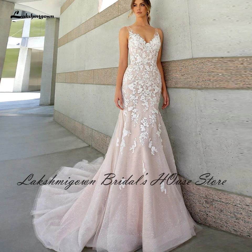 Lakshmigown блестящее розовое свадебное платье русалки с открытой спиной 2022 Vestito da Bride Кружевная аппликация блестки свадебные платья