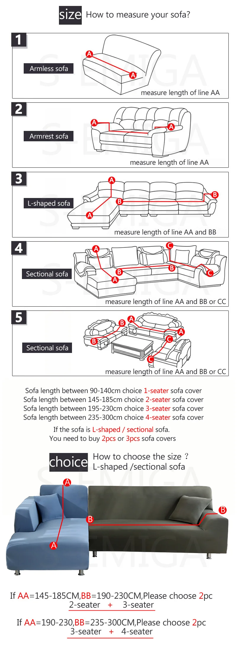 Для L типа или углового или секционного дивана, который в сочетании с 2 частями отдельно, вам нужно заказать 2 шт покрытия для него. Размер чехла будет зависеть от длины линий AA, BB и CC.