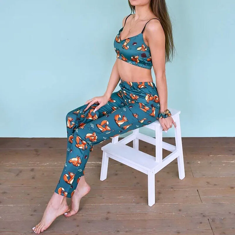 Пижама женская атласная с V-образным вырезом, комплект из двух предметов, пижама на бретелях-спагетти с принтом лисы, пикантная одежда для сна, на лето