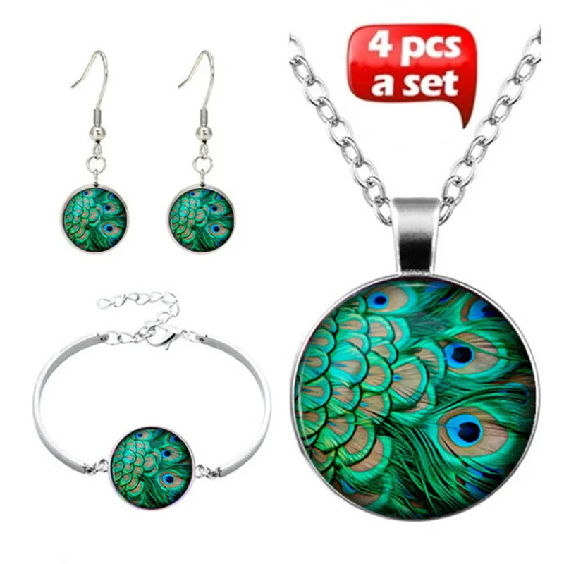 Комплект женских ювелирных изделий, браслет, серьги, павлинье перо, кабошон