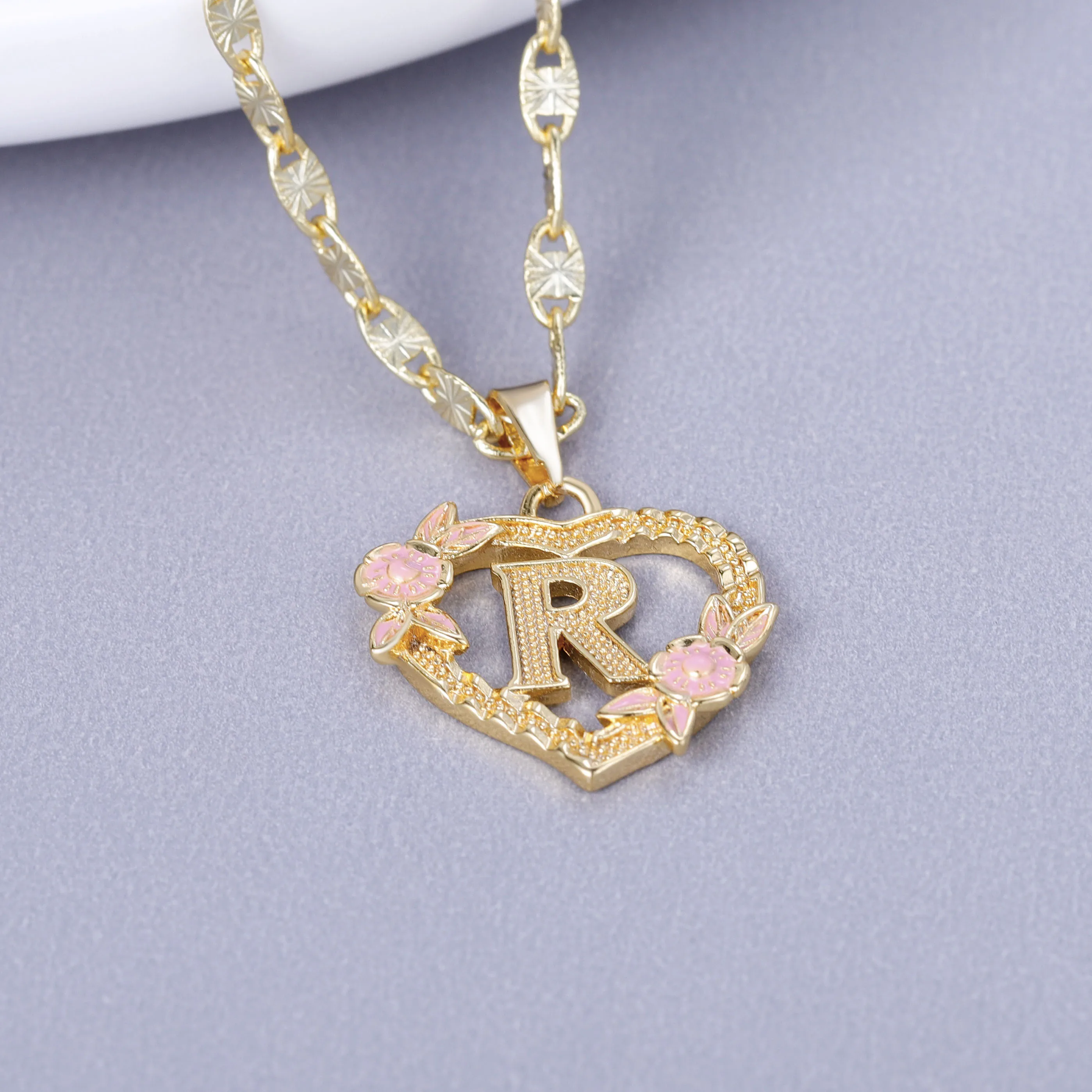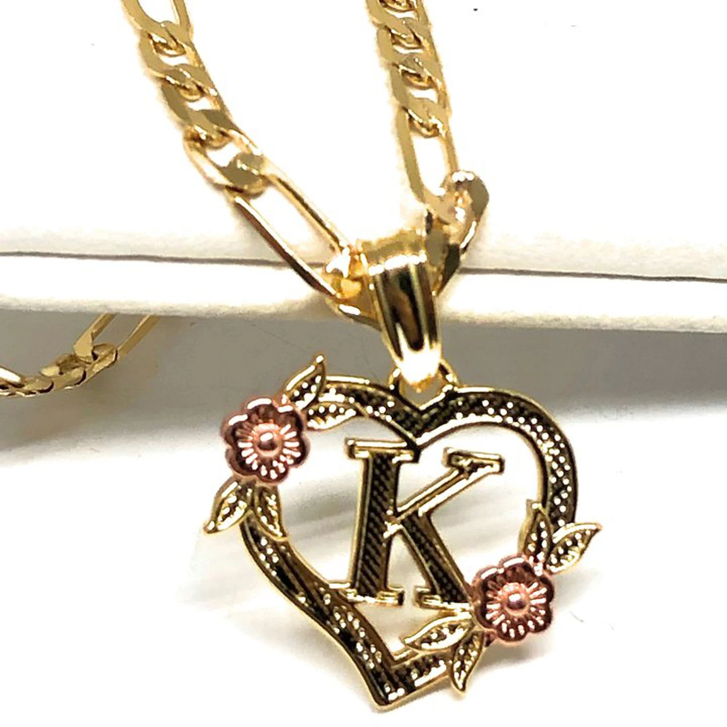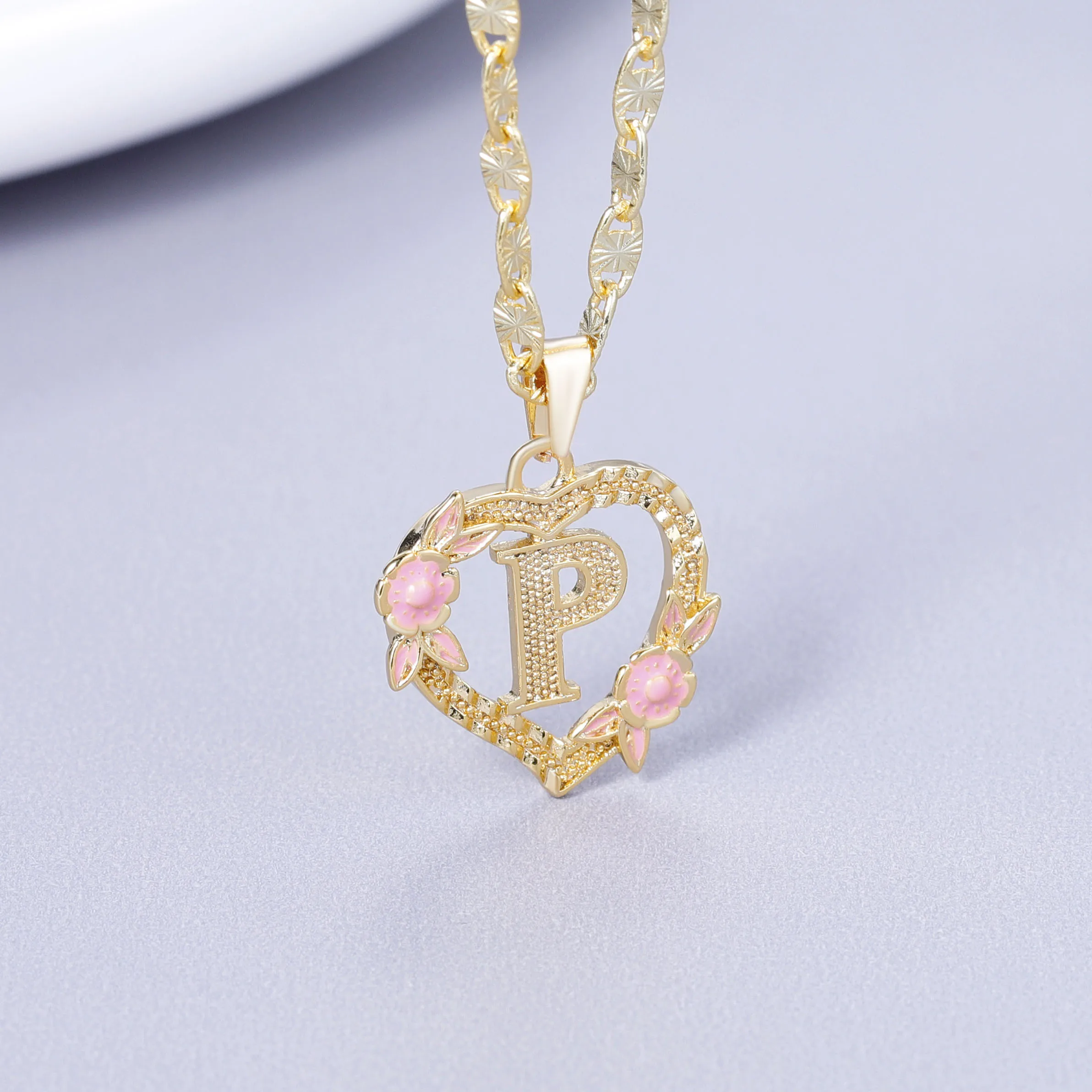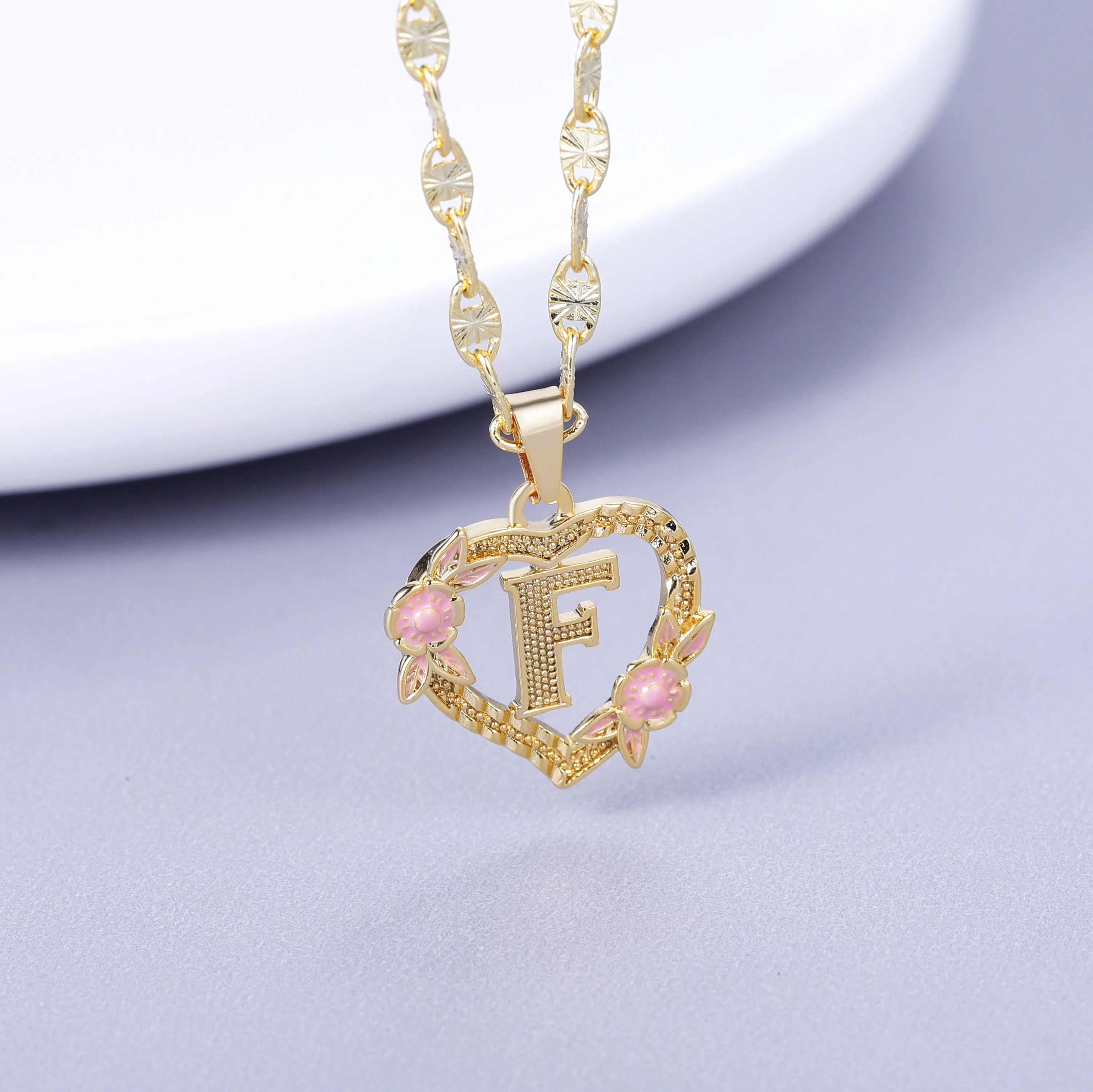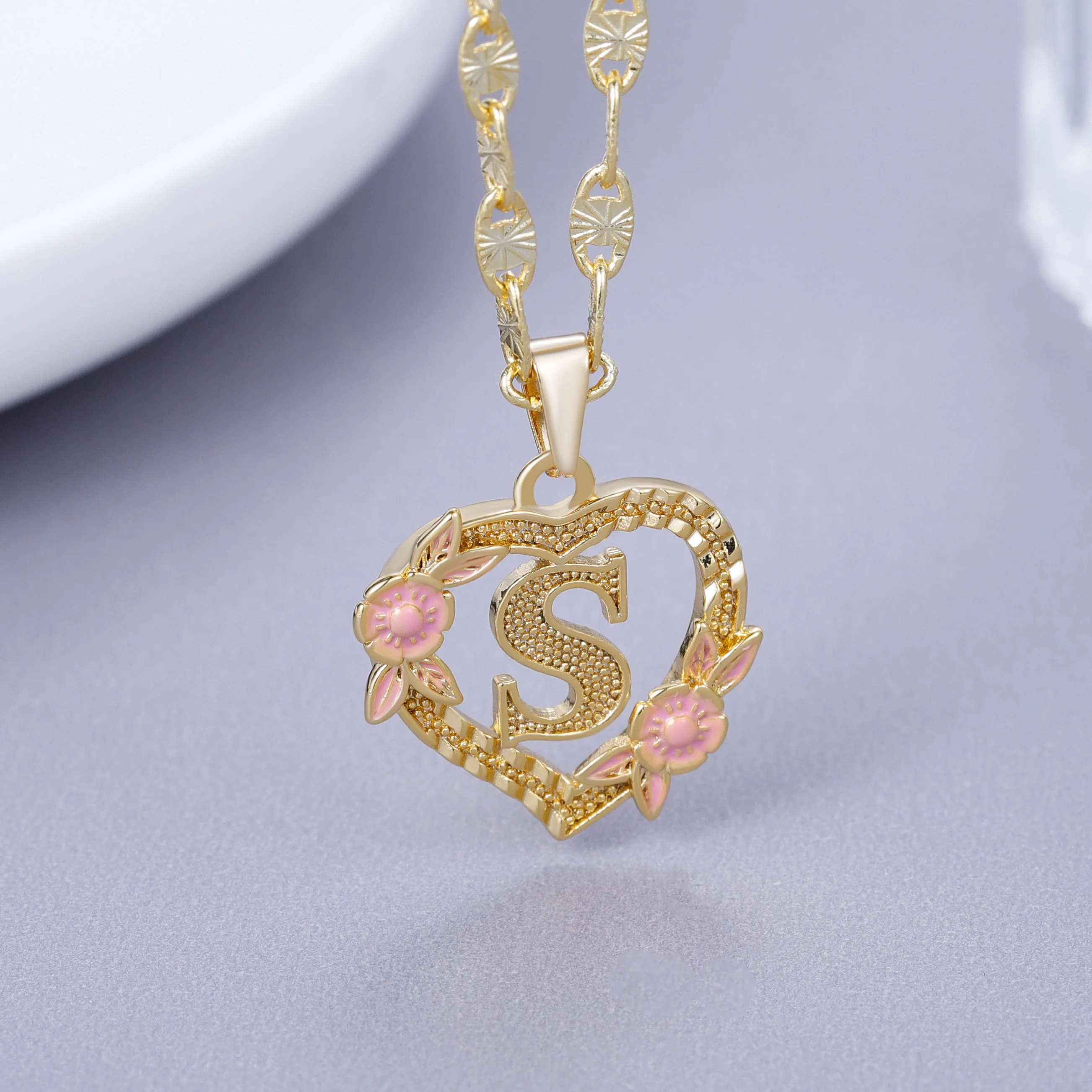 Позолоченная подвеска в форме сердца, цветка, инициала, буквы с цепочкой Фигаро 24 дюйма, 4 мм, ожерелье в форме сердца, подарок на день Святого Валентина