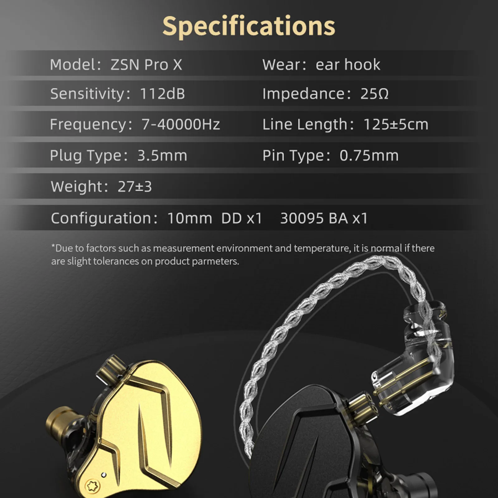 Особенности:[Обновленный внешний вид]Уникальный блеск металла сочетается с блеском импортной смолы, и каждый угол ослепляет, благодаря изысканному мастерству и детальному внешнему виду.[Улучшенное качество звука]Регулируя Магнитный зазор двойной магнитной динамики 10 мм, Наушники обладают богатой низкочастотной мощностью и обеспечивают широкий частотный отклик, что создает ощущение звука, как на месте.[Конфигурация обновления]30095 высокочастотный сбалансированный арматурный блок + 10 мм низкочастотный Гибридный Драйвер, настраивается и плавится профессиональными и научными регулировками, что создает захватывающий звуковой эффект, придавая человеческому голосу богаче и четче деталей.[Обновленный кабель]Используйте кабель с серебряным покрытием высокой чистоты 100 ядер, который уменьшает потери или искажение передачи сигнала, обеспечивая широкое и естественное звуковое поле. С гуманизированной съемной конструкцией кабеля наушники могут быть модернизированы, чтобы быть гарнитурой BT путем сборки различных кабелей, изучения более новых способов игры.[Удобная одежда]Изогнутая полость имеет эргономичную конструкцию, которая плотно и удобно сидит на ушной раковине. Благодаря эластичной трубке из искусственной кожи с эффектом памяти вокруг уха ее можно носить надежно и свободно.Характеристики:Бренд: KZМодель: ZSN PRO XМатериал: цинковый сплавЦвет: черный/золотой(Опционально)Провод управления: без микрофона/с микрофоном(Опционально)Износ: ушной крючокЧастота: 7-40000 ГцЧувствительность: 112 дБ/мВтТип штекера: 3,5 ммPin Тип: 0,75 ммДлина линии: 125 ± 5 смПосылка Размеры: 10,4*7,5*3,4 см/4,09*2,95 * 1.34inВес посылка: 82 г/2,89 унцийПримечание:Пожалуйста, внимательно прочитайте руководство пользователя перед использованием этого продукта.Посылка:1 * Наушники с проводом6 * силиконовые колпачки для ушей1 * Руководство пользователя