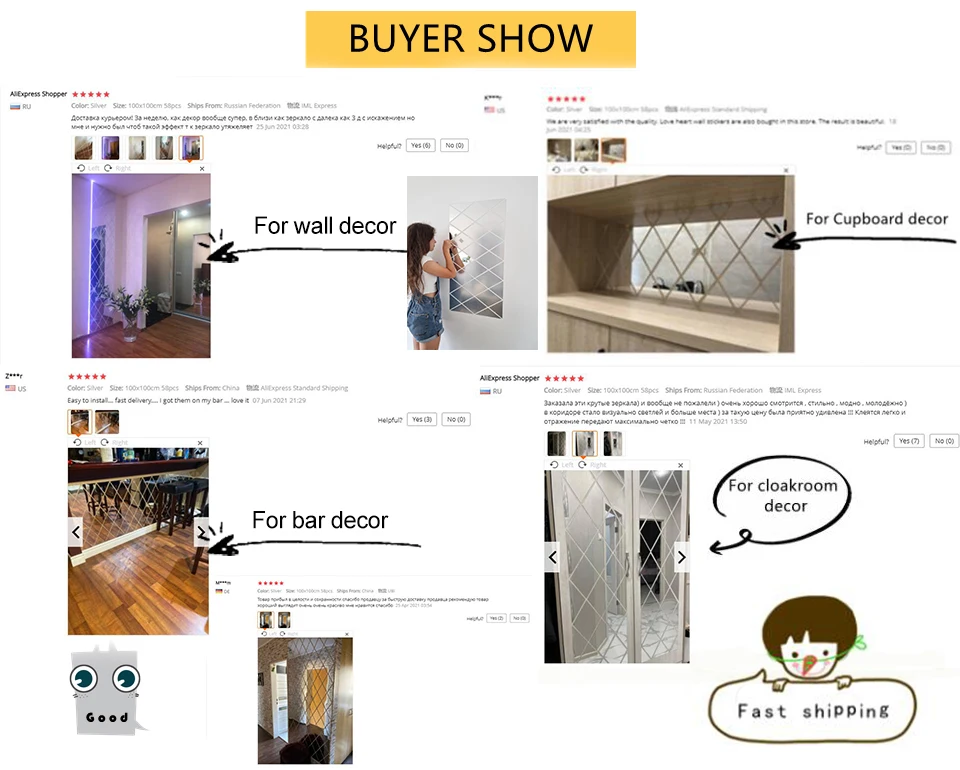 2. Это зеркальная Настенная Наклейка с зазором посередине. Это сделай сам. Это может определить эффект презентации зеркальной наклейки. Толщина стены и расстояние станции все связаны. Это в основном для украшения, а не для зеркала. Надеюсь, что мы можем купить его, прежде чем смотреть много шоу покупателя