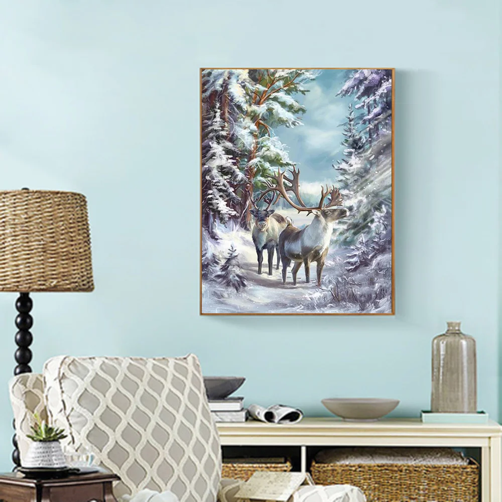 Алмазная живопись Huacan, Зимний лес, квадратнаякруглая вышивка, мозаика с оленем, домашний декор