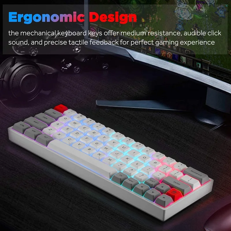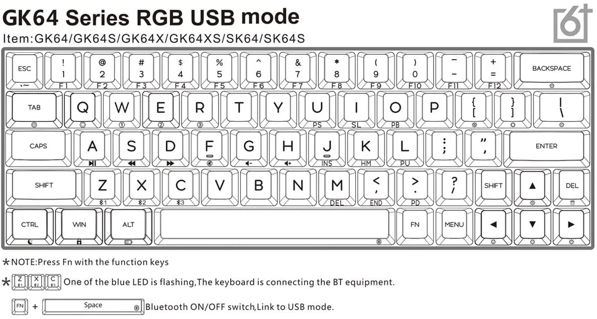 SK64/SK64SSK64:PBT Keycaps/проводное соединение (USB Type C)SK64S: Keycaps PBT/проводное соединение (USB Type C) и беспроводное соединение bluetooth (FN + Space может переключаться между проводным режимом и режимом Bluetooth, литиевой батареей 1900 мАч.)Особенности:100% новый товар высокого качества.64 механических ключа со стандартным выравниванием покера.Более 100 миллионов нажатий клавиш, в 2 раза дольше, чемТрадиционная механическая ось.Корпус из АБС-пластика, двухцветная крышка для ключей ABS/PBT, Классическая и модная.Водонепроницаемый/пылезащитный/антикоррозионный.3-слойный программируемый режим загрузки (RGB версия).Замечательная сияющая подсветка, 16 миллионов цветов RGB световые эффекты дляОтвечает требованиям геймеров.Настройте заднюю подсветку Вашей Клавиатуры через приложение программного обеспечения.Эргономичный дизайн игровой клавиатуры обеспечивает наиболее удобный игровой опыт.【RGB подсветка 】: 16,8 миллионов цветовых комбинаций, несколько режимов подсветки (Аврора, пульсация, музыка, радуга, волны, градиент, ветряная мельница, спектр и одиночный светильник), никаких драйверов не требуется. Plug & Play небольшой форм-фактор клавиатуры【Оптические переключатели gateron 】 оптические переключатели gateron можно использовать по желанию и заменять другими переключателями. Клавиатура с горячей заменой не требует возврата к переключателям для припоя/демонтажа. (Горячая замена только с оптическими переключателями)Keykeycaps】проводной черный цвет изделия ABS keycaps, остальные элементы являются PBT keycaps.【Макросъемка и другие функции 】 запись макросов через программное обеспечение, настройка расширенных функций, Персонализация функциональных клавиш... Полный режим защиты от Ghosting (NKRO).【Совместимость с Mac и Windows】: Совместимость с Windows 10, Win 8, Win 7, Win Vista, Windows XP и Mac OS, SK64 поставляется с usb-кабелем типа C 60 дюймов. Клавиатура адаптирована для всех условий окружающей среды, домашнего и офисного использования, небольшой форм-фактор для крошечных пространств.SK64-это стандартная клавиатура 60% с подсветкой RGB, проводным подключением к USB-C и оптическими переключателями. Кабель USB-C отстегивается для удобства переноски.Оптические переключатели гораздо прочнее, чем обычные механические переключатели клавиатуры и рассчитаны на 100 миллионов нажатий клавиш.Они имеют высокую пунктом возбуждения 1,5 мм для быстрого ответа. Светильник Strike optical switches использует горизонтальный инфракрасный луч, который передается по ширине внутреннего кнопочного выключателя.Инфракрасный луч, как правило, блокируется от достижения датчика поперек от него стволом. После нажатия выключателя ствол выключателя больше не блокирует инфракрасный луч и луч обнаруживается датчиком, который активирует переключатель.Благодаря оптический механизм волоконно-оптической имеет очень быстрое время отклика 0,2 мс, что означает, что быстрее реакций в тех времен, когда время имеет решающее значение, как, например, при играх.FN функции:Fn + Back: включение/выключение светильник.Fn + P/[{: яркость вниз/вверх, 21 уровень регулируется. FN + Q: онлайн-модель, вы можете выбрать много подсветки и макросов. FN + W/E/R: автономная Модель. FN + W: модель 1, функция по умолчанию-обычная клавиатура. FN + E: модель 2, функция по умолчанию-F1, F2, F3.... FN + R: модель 3, функция по умолчанию-PS, SL, PB, Ins, HM, PU, Del, End, PD.Точка доступа привода:1. Светильник DIY2. Мощные игровые макросы3. Есть сотни э