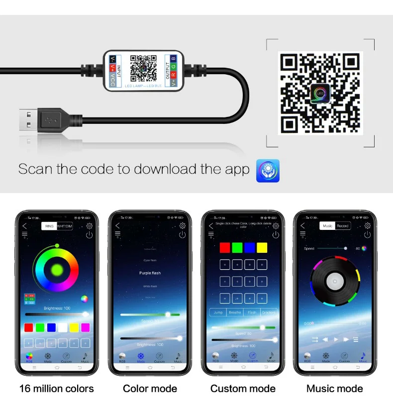 4. USB зарядка: 5 В usb интерфейс просто хорошо, удобно, внешний аккумулятор, мобильный телефон зарядное устройство, компьютер может быть использован5. Управление приложением: Сначала установите приложение на мобильный телефон, загрузите приложение «светодиодный светильник» и сравните его с Bluetooth. Пульт дистанционного управления не требуется. 6. Яркость и скорость: яркость можно регулировать в пределах 12 м через приложение, яркость регулируется от 1% до 100%, и скорость регулируется.7. Цвет Millons: более 16 миллионов цветов могут изменить цвет и обеспечить 7 режимов сцены и 29 динамических режимов.8. Еще один светильник приложения: Контролируйте менее 10 групп светильник s одновременно, чтобы продолжать работать в одном цвете.