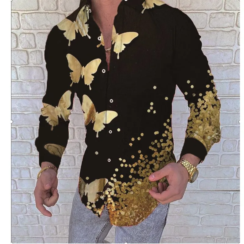 Новинка 2021, модная мужская рубашка, шелковые Атласные Рубашки с принтом бабочки, Мужские приталенные рубашки, повседневные праздничные рубашки с отложным воротником и длинными рукавами