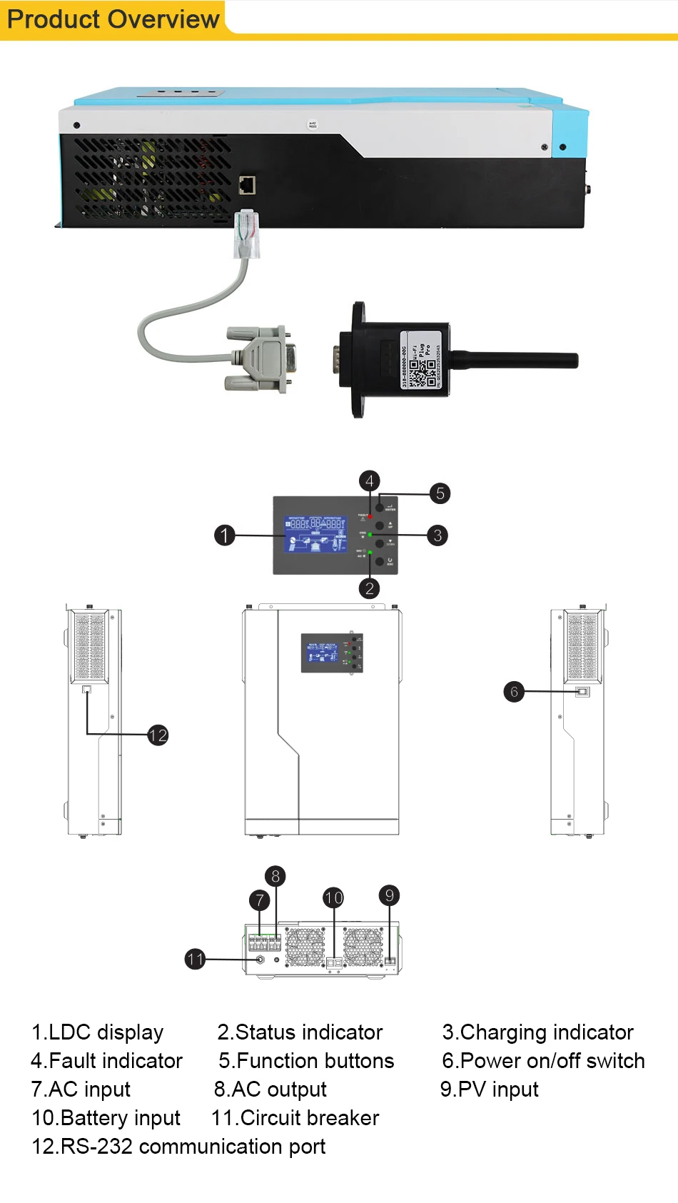 Особенности:Инвертор чистой синусоидальной волны6,0 кВт со слежением за максимальной точкой мощностиСолнечное зарядное устройство с максимальным зарядным током 100A120-500 в широкий PV входЛитиевая батареяНе может работать без аккумулятора