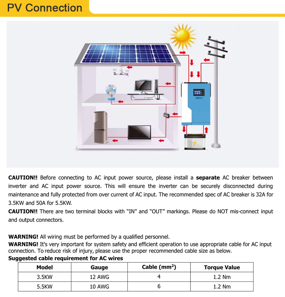 Генерирует энергию от PV непосредственно для подачи нагрузки, даже без батареиЭффективность PV до AC намного вышеПожалуйста, знайте, если инвертор не подключает батарею, напряжение PV должно быть более 200 В постоянного тока.Набор пыли необходимо приобрести дополнительно