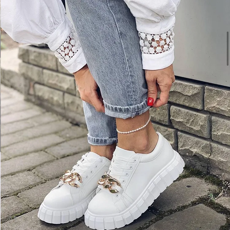 Женские кроссовки на плоской подошве, из искусственной кожи, с металлической цепочкой, на шнуровке, весенне-осенние, повседневные, большой размер 43