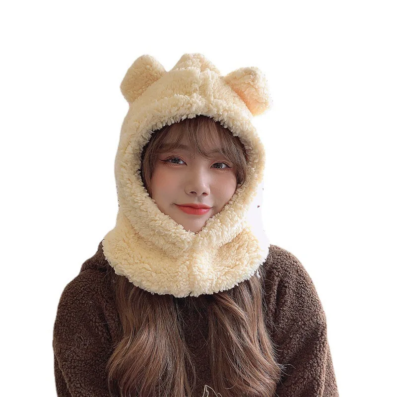 Модная зимняя женская шапка, новинка, Шапка-бини, теплая шапка с милыми медвежьими ушками, повседневный комплект из плюшевой шапки и шарфа, повседневная однотонная женская шапка