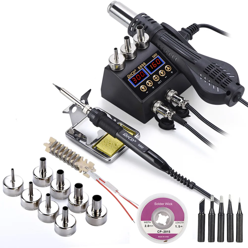 Нагреватель горячего воздуха и сварочный Утюг 2в1 паяльная станция.Двойные цифровые ЖК-дисплеи для отображения точной температуры.Чрезвычайно низкий уровень шума и компактный дизайн.Функция интеллектуального самообнаружения обеспечивает безопасную персональную работу.Функция автоматического охлаждения для эффективного продления срока службы нагревателя и защиты нагревателя горячего воздуха.