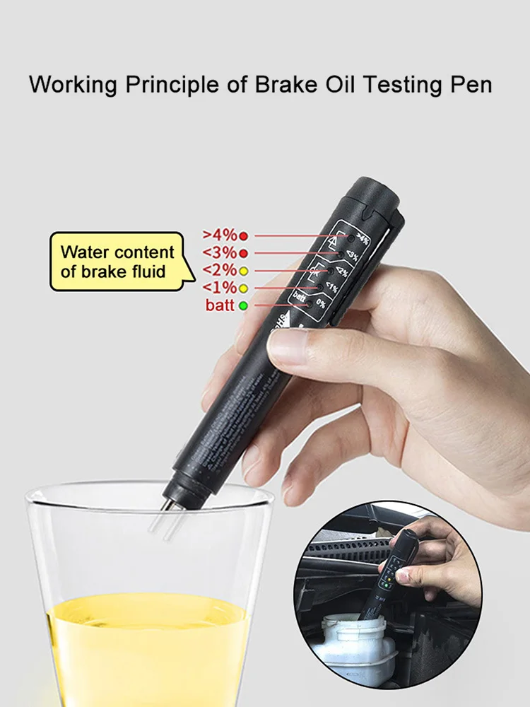 Особенности:1. Проверьте качество автомобильной тормозной жидкости.2. Светодиодный светильник показывает процент влаги в тормозной жидкости.3. Автоматическое выключение.