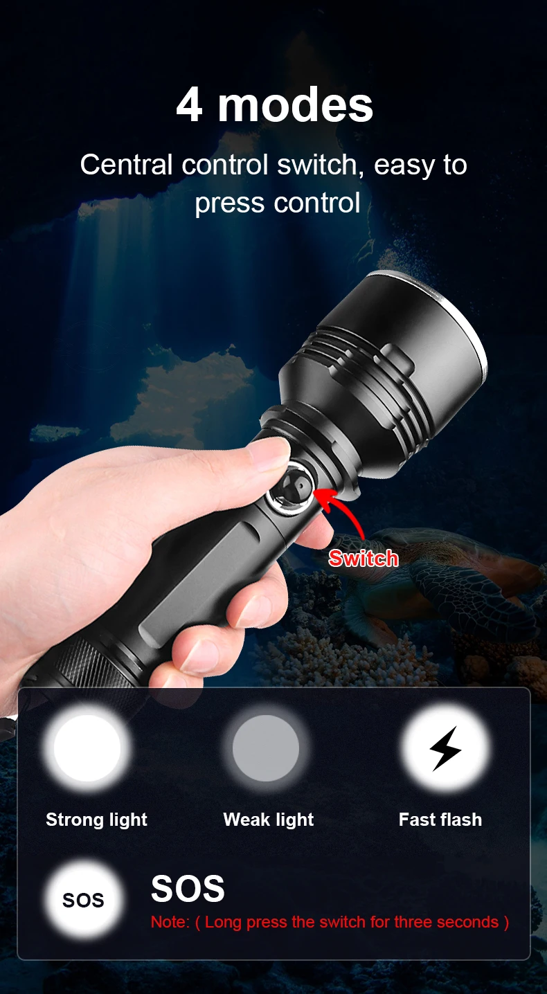 1. Используя новейшие лампы XHP100, непрерывный срок службы до 100000 часов.2. Используйте аккумуляторы 18650 или 26650, длительный срок службы батареи.3. 4 режима: (высокий, средний, стробоскоп, SOS), вы можете переключить желаемый режим в различных средах.4. Водонепроницаемый Профессиональный светодиодный фонарик IPX8 для дайвинга позволяет свободно нырять.5. Используя авиационный алюминиевый сплав и Цельнометаллический корпус с числовым программным управлением технологии производства, высокая прочность, и светильник на единицу веса; Это не боится падений, не боится давления и приятный на ощупь.6. Он используется для различных видов спорта на открытом воздухе, таких как дайвинг, альпинизм, кемпинг, туризм и т. д.