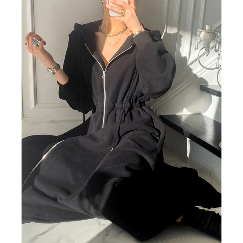 Свободное черное платье с капюшоном и высокой талией, с капюшоном, на молнии, женское повседневное универсальное платье, осенне-зимнее Макси платье для женщин