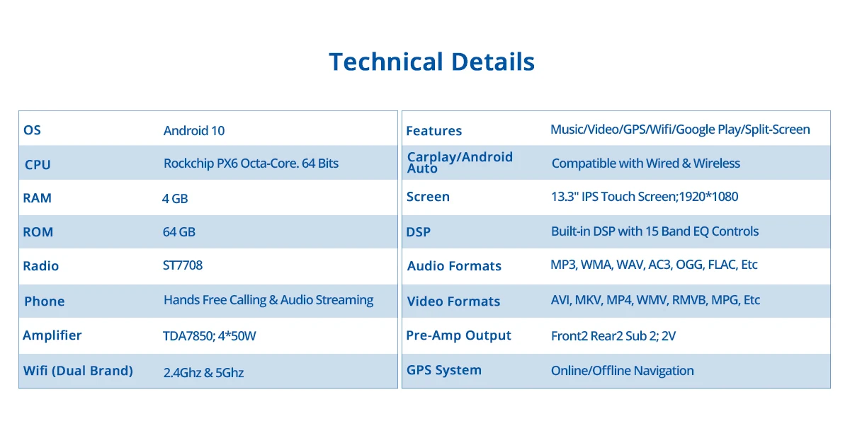 1.【Specifications】: android 10,0/PX6 шестигранный процессор/4 ГБ ОЗУ/64 Гб ПЗУ/экран IPS/разрешение 1920*1080/встроенный WiFi/Встроенный DSP/Интернет/4 аудиовыхода/2 sub Out / 3 USB порта2. 【Совместимость транспортного средства 】: подходит для транспортного средства с одним разъемом din. В комплект входят только жгуты iso и жгуты для автомобиля nissan без заводской задней камеры и усилителя. Если вам нужен другой ремень, вам нужно связаться с продавцом с изображением вашей приборной панели.3. 【Carplay & Android Auto】 Наслаждайтесь любимым приложением-проводная carplay & android auto, это позволяет Вам легче, чем когда-либо, перемещаться, общаться и воспроизводить музыку в дороге.4. 【Internet】 WiFi может дать вам доступ к прослушиванию онлайн-музыки, просмотру видео и загрузке приложения. Он также имеет встроенный слот для sim-карты, вы можете получить доступ к Интернету через встроенный слот для интернет-карты 4G.5. 【Features】проводной Carplay & Android Авто/Управление рулевым колесом/bluetooth Hands Free вызов/gps-навигация/сплит-экран/Регулировка DSP/Интернет/Goggle Play Store/видео/радио