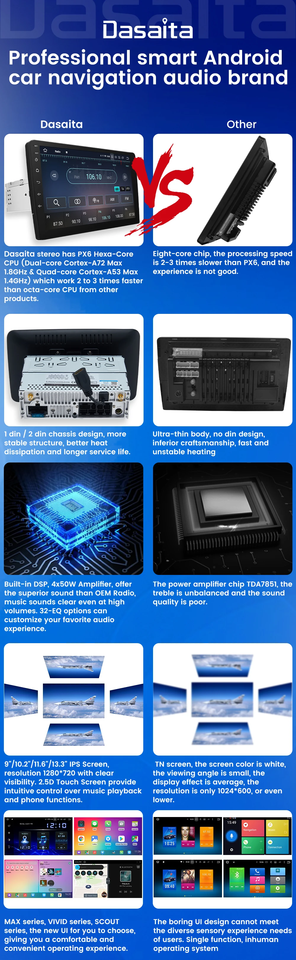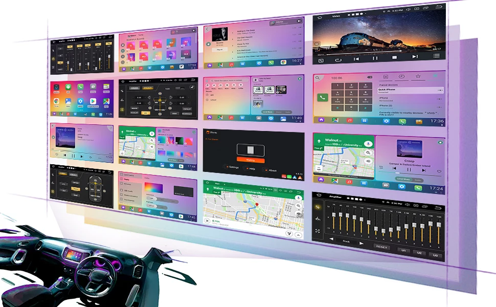 Стереофонического сигнала для автомобиля с сенсорным экраном имеет встроенный DSP 30-полосным эквалайзером и ST7708 4*50 Вт усилитель выход. Несколько вариантов настройки: Pop, Rock, Jazz, Classic, Flat, User, Voice и т. д.