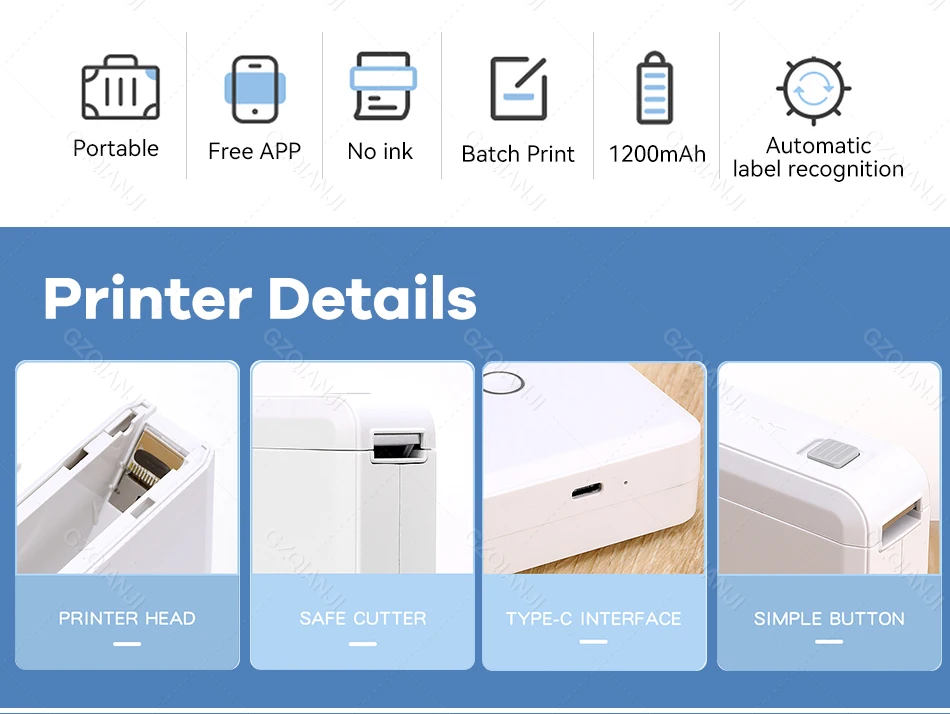 Беспроводной дизайн, поддерживает печать на большие расстояния.Беспроводное расстояние до 10 м.Прямой тепловой, без чернил, тонера или лент.Поддерживает все основные форматы этикеток: цена, дата, размер, вес, имя и т. д.Универсальный, простой в использовании.Компактный и легкий, удобный для переноски.Аккумулятор емкостью 1200 мАч поддерживает длительное использование.Характеристики: