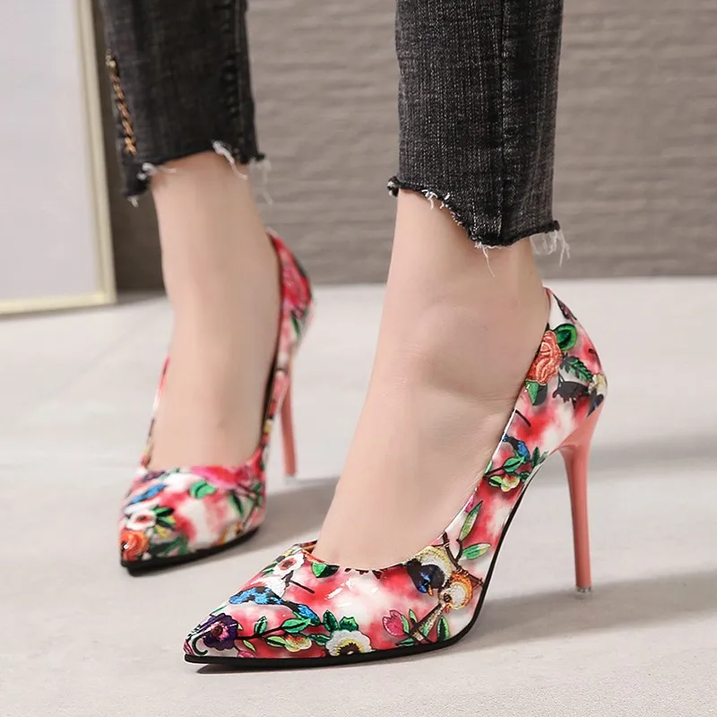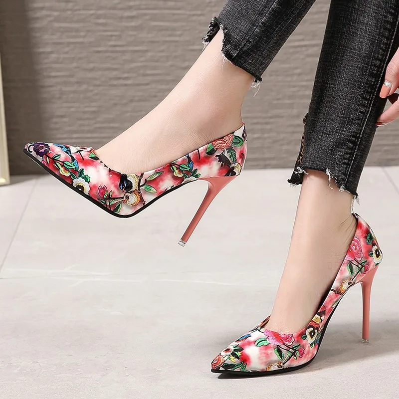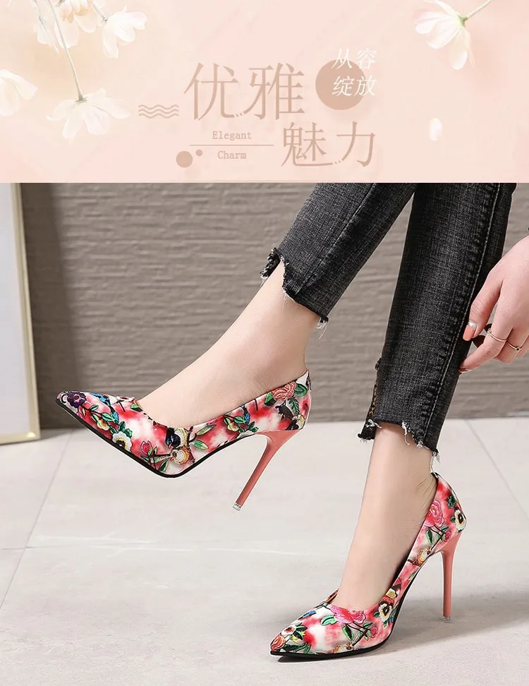 Новинка весна-осень 2021 пикантные туфли с цветочным принтом на очень высоком каблуке-шпильке с острым носком Женские однотонные туфли