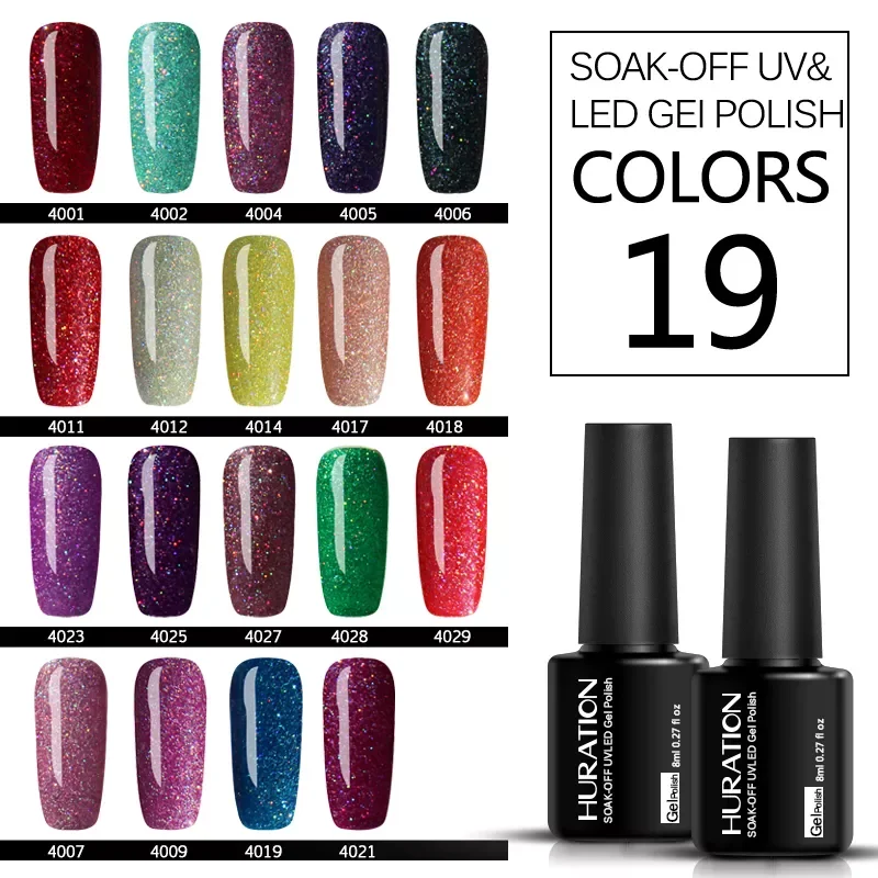 Характеристики: Новинка: Huration Тип: впитывающий УФ-Гель-лак Цвет s: 19 блестящих цветов Вес нетто: 8 мл Эффект: блестящий цвет