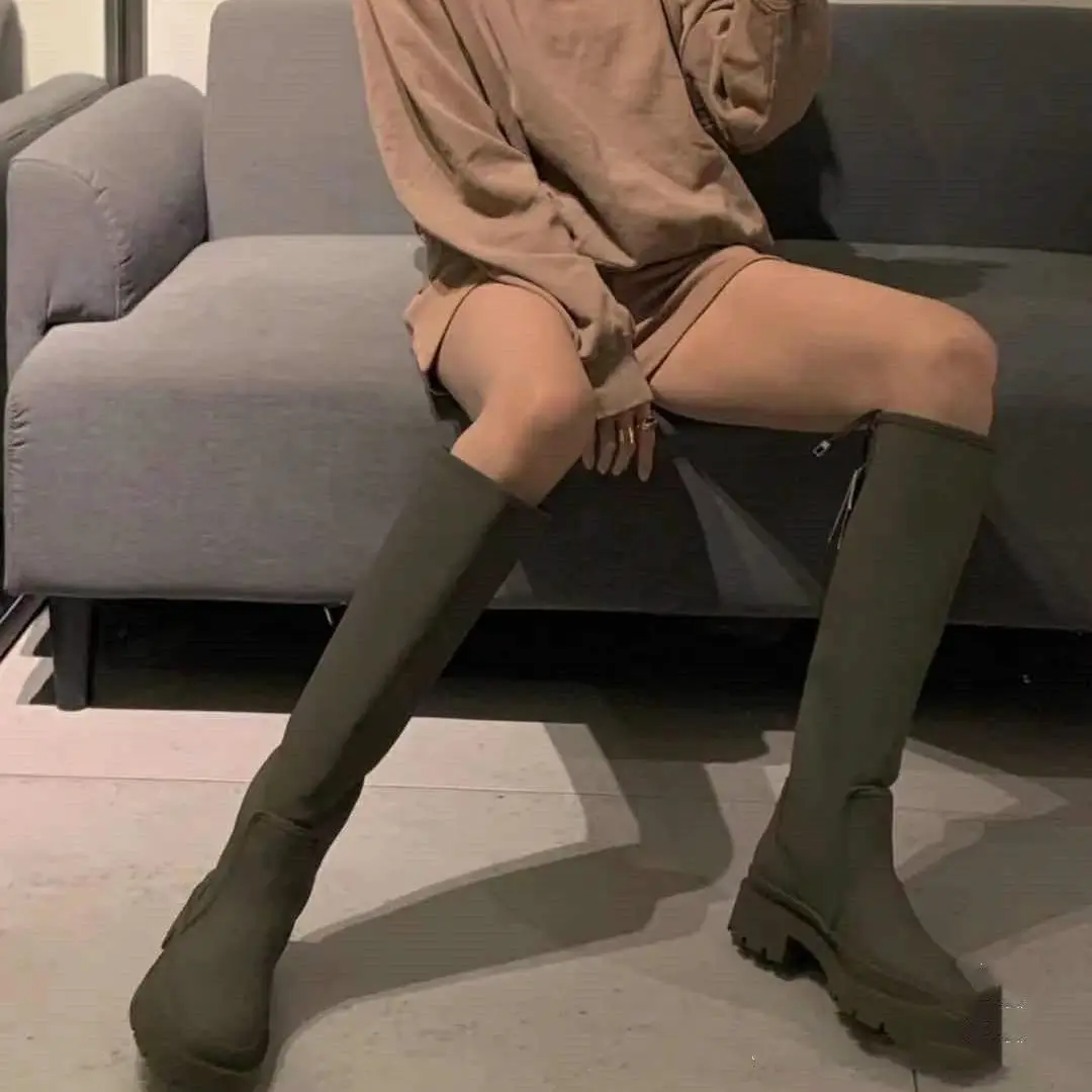 Женские повседневные сапоги до колена, сапоги на платформе с круглым носком, без застежки, на массивном каблуке, роскошная брендовая дизайнерская зимняя обувь, новинка 2022