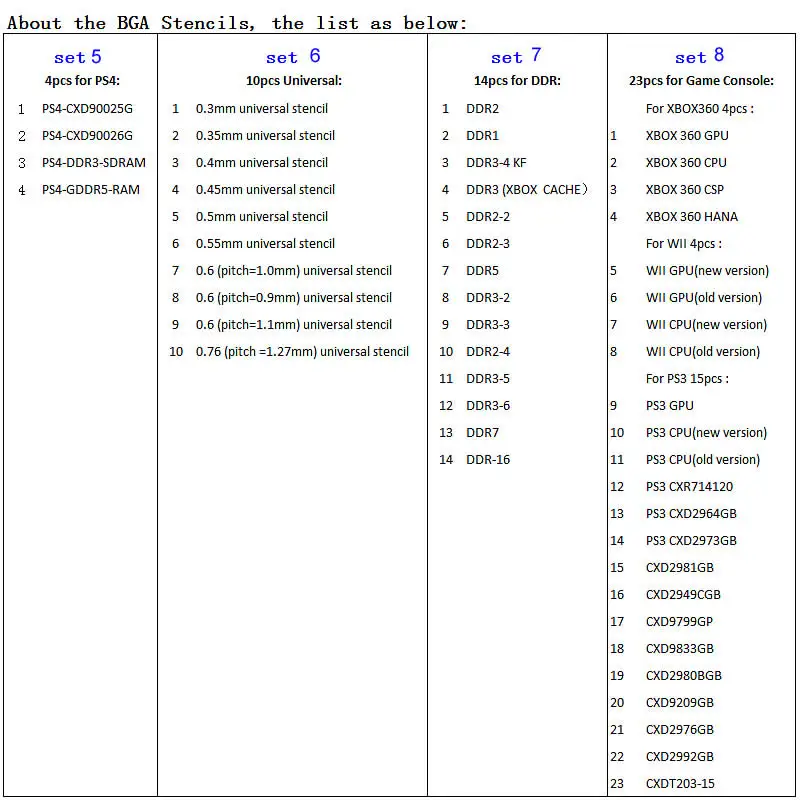 Мы можем поставить несколько BGA переработки/пайки материалов, как, например, рерабочая станция, трафареты для шариков припоя, паяльная паста и так далее, если вам нужна какая-либо из них или других, пожалуйста, не стесняйтесь связаться с нами.