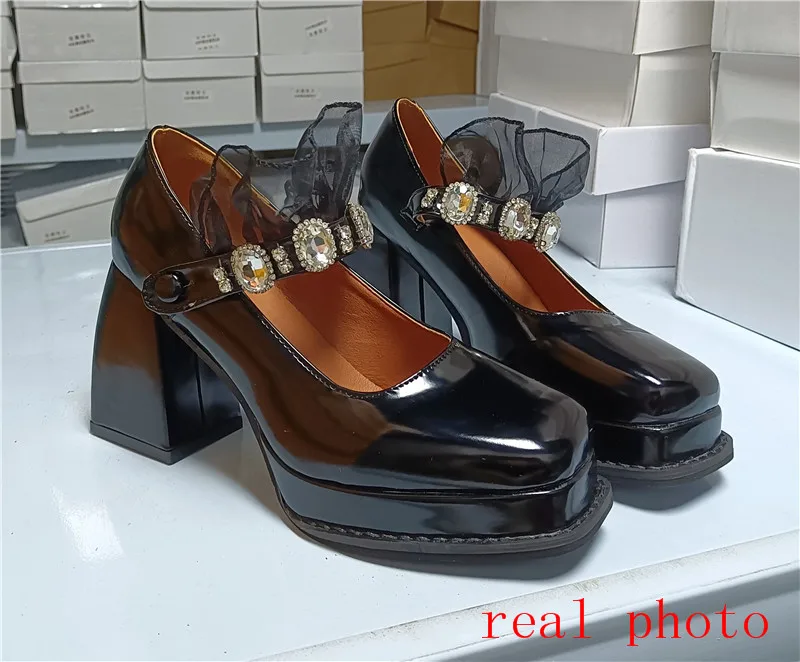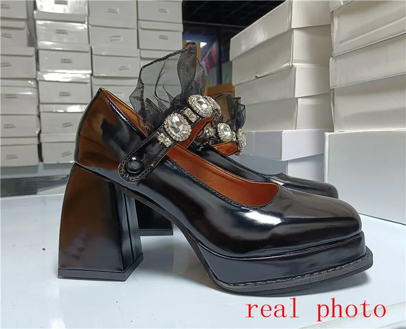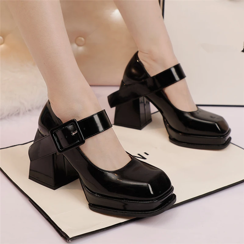 Обувь на платформе; Женские туфли-лодочки с квадратным носком на не сужающемся книзу массивном каблуке; Новые модные туфли на высоком каблуке из лакированной кожи; Цвет Черный; Туфли Mary Jane на платформе
