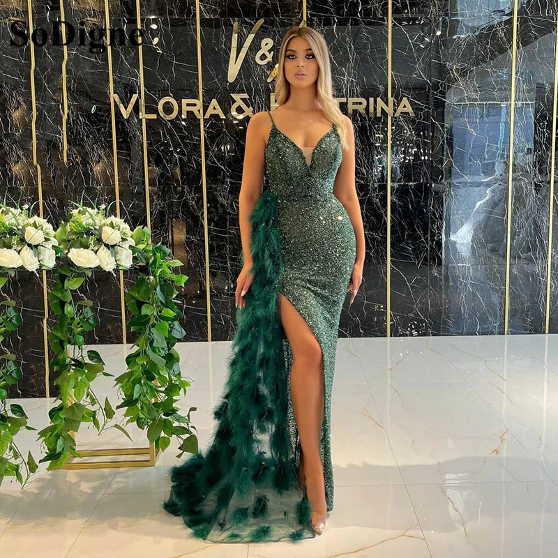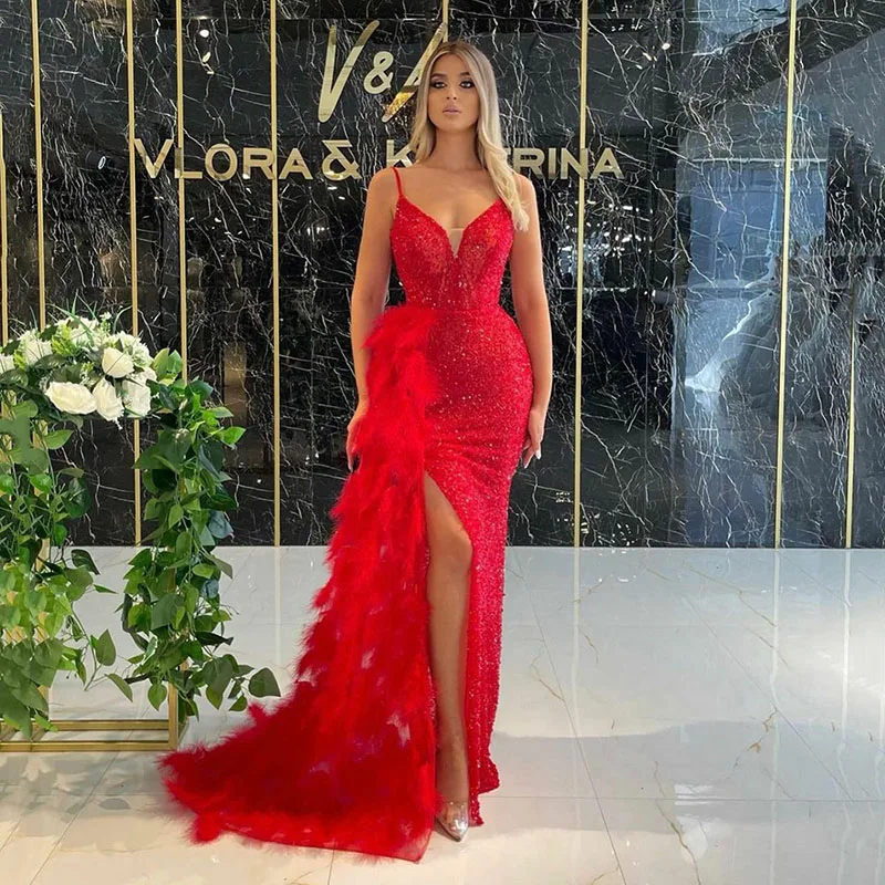 Женское вечернее платье с перьями, со съемным хвостом и разрезом
