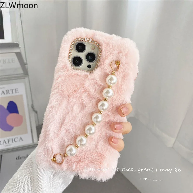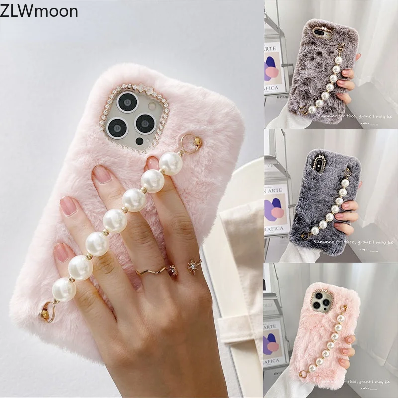 Роскошные Жемчужные пушистые плюшевые Силиконовые чехлы с ремешком ...