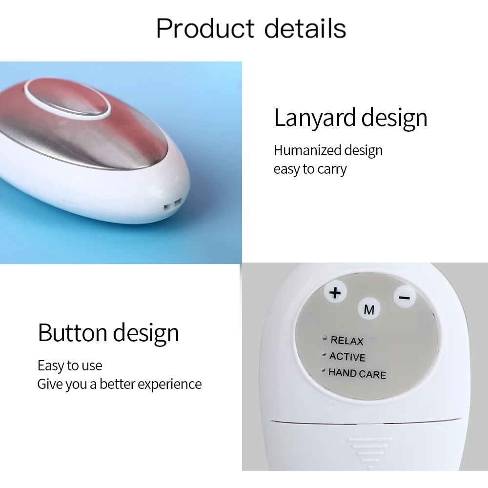 Материал: пластикФункция: EMS массаж, микро-токовый массаж, массаж рук, массаж тела, помощь во снеРежим: 2 типаТекущий рейтинг: Уровень 5Время работы: 20 минутМощность: 0,5 WЕмкость аккумулятора: 500 мАСпособ зарядки: usb-кабельРежим загрузки: Длительное нажатие в течение 3 секундИнструкции:1. Удерживайте переключатель в течение 3 секунд, чтобы запустить продукт, и белый светильник индикатора работы;2. "+-" регулирует интенсивность тока4. Положение шипа продукта касается кожи, что позволяет высвобождать микро-токовый массаж, который может использоваться для массажа других частей телаМеры предосторожности:1. Этот продукт имеет низкую токовую конструкцию, и ток уровня 1-3 относительно слабый. Рекомендуется испытать продукт с уровня 1;2. Только расположение шипа продукта может выпустить микро-токовый массажРазмер изделия: 7*3*2 см