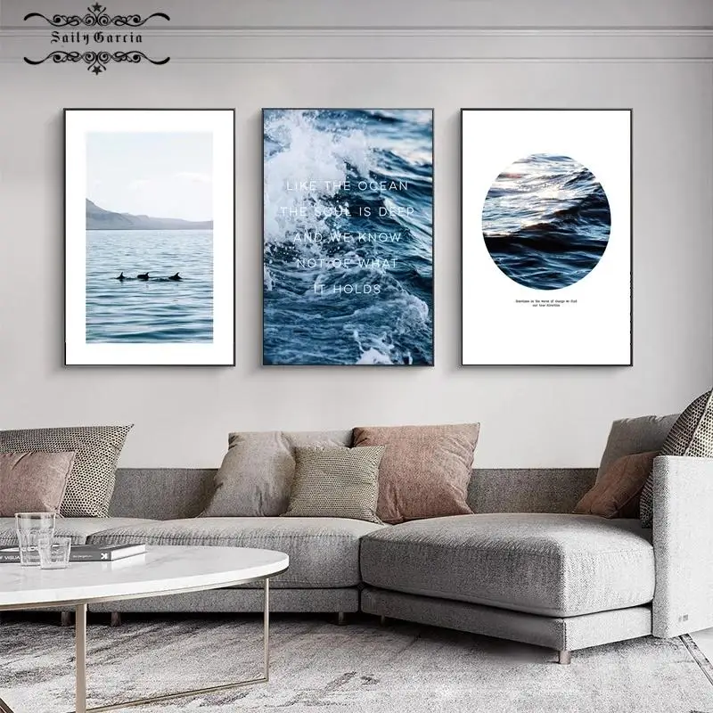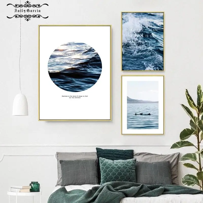 Настенный плакат средиземноморского синего океана и печать морских волн, холст, живопись, цитаты, современные картины, гостиная, домашний декор