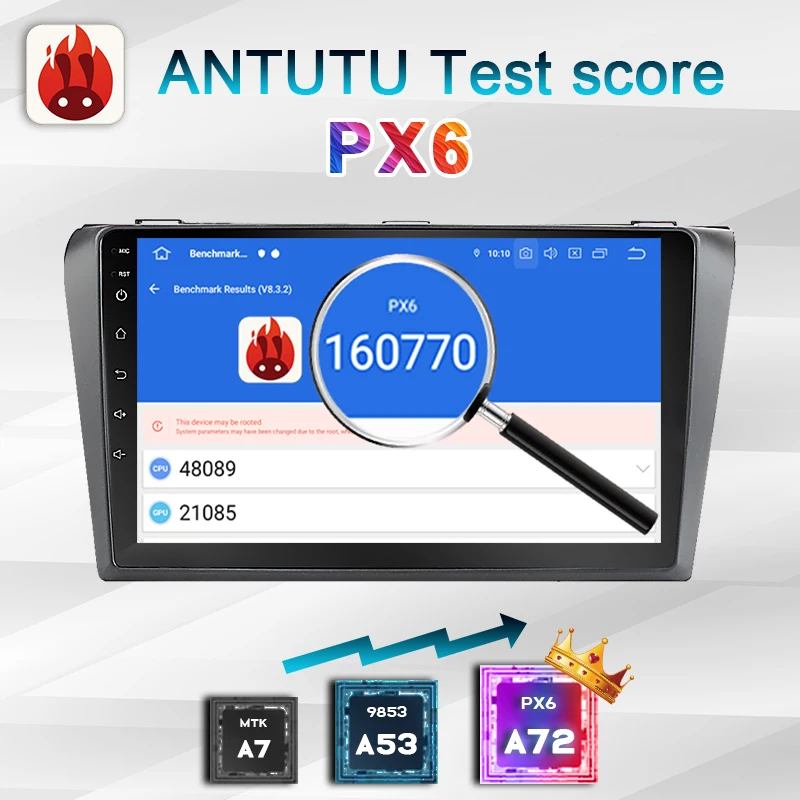 PX6PX6 является лучшим чипом на рынке в настоящее время, он работает быстрее, чем все другие типы. Балл ANTUTU составляет 160770, что лучше 9853 4G + 64G, PX5 и всех других типов 4 + 64G на рынке. По сравнению с другими радио типа fo, PX6 radio может загружать больше видов приложений android с android market, и приложение может работать лучше.