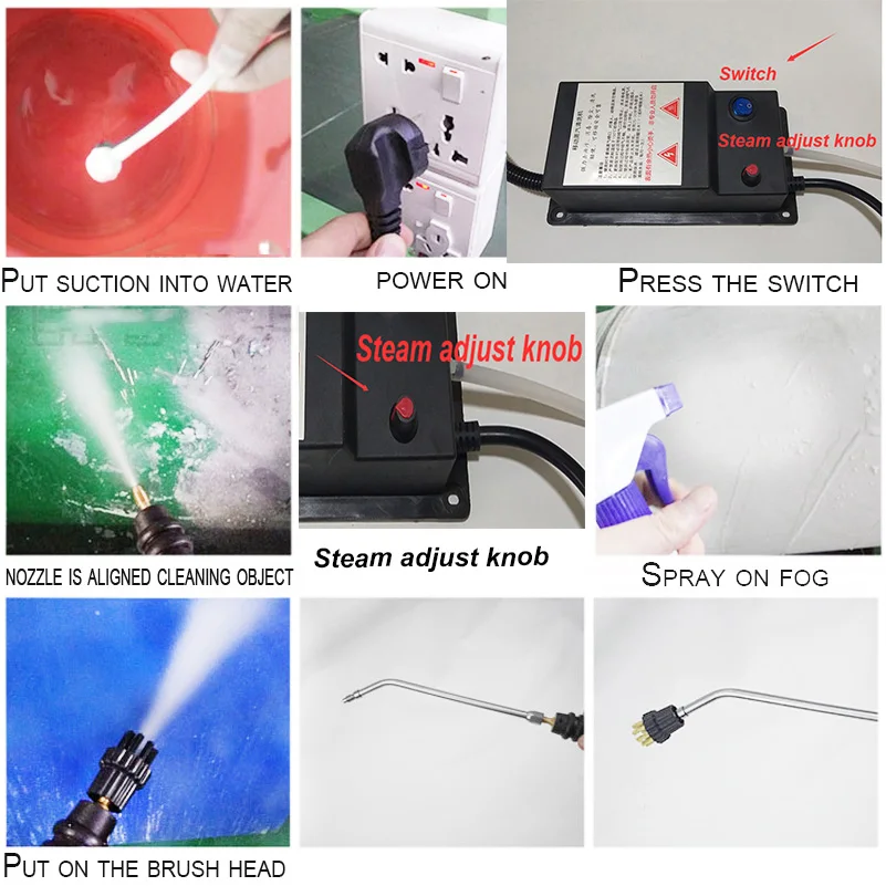 Как использовать?1. Поместите всасывание в воду2. Включение питания3. Нажмите переключатель4. Сопло выровнено с регулировкой чистящего объекта5. Регулировка тумана6. Спрей на тумане7. Наденьте головку кисти