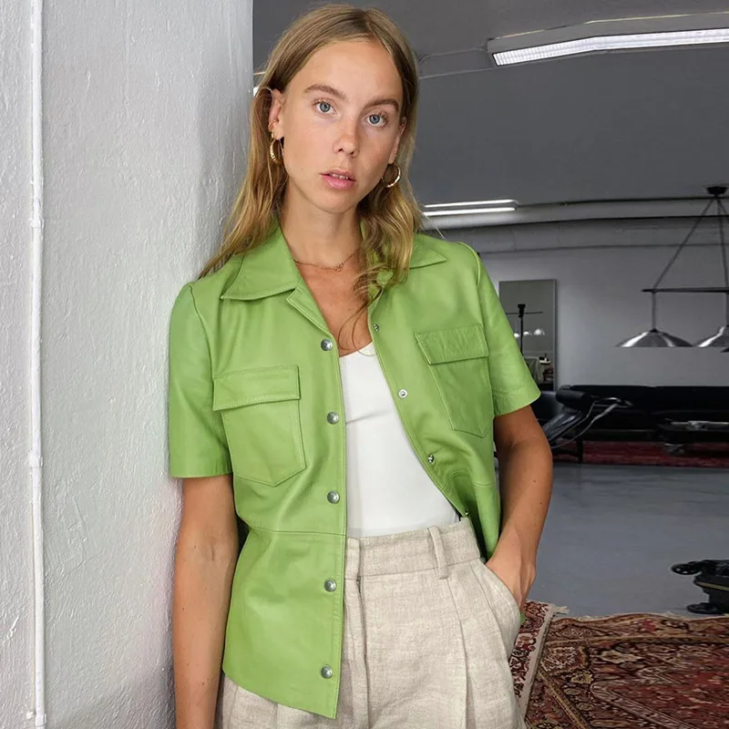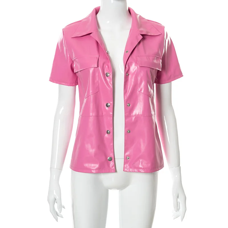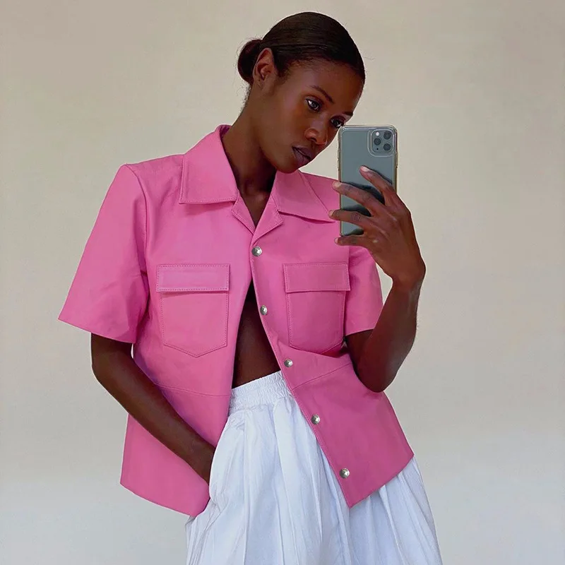 BOOFEENAA искусственная кожа пальто и куртки для женщин уличная мода короткий рукав Укороченный кардиган рубашки розовый зеленый цвет