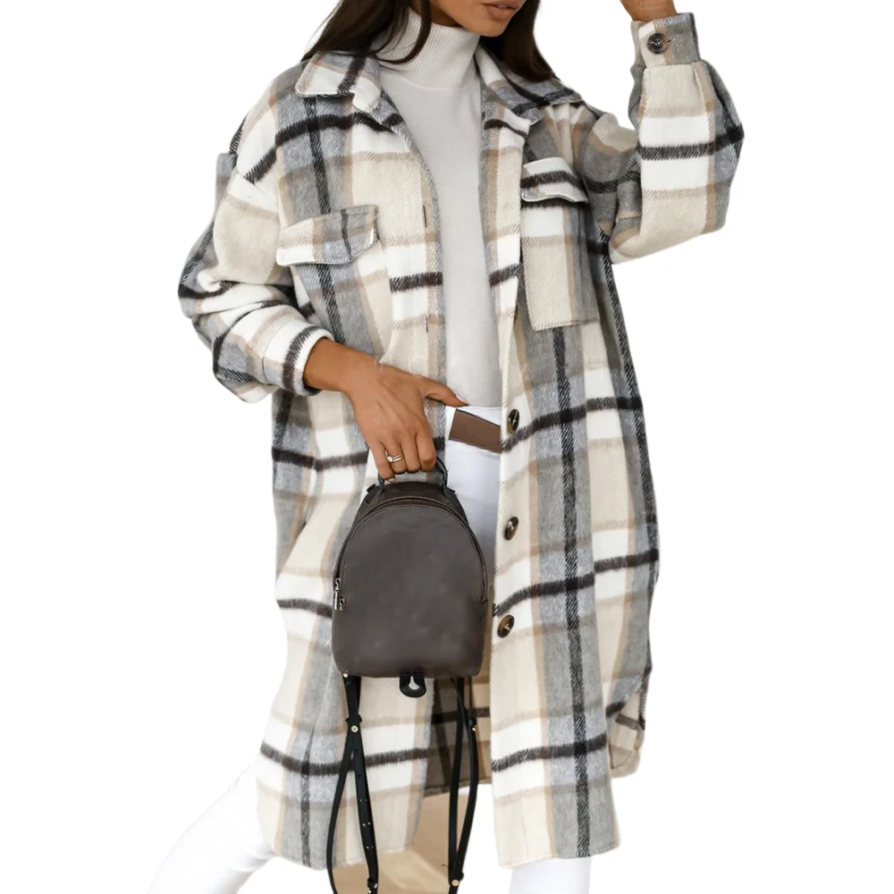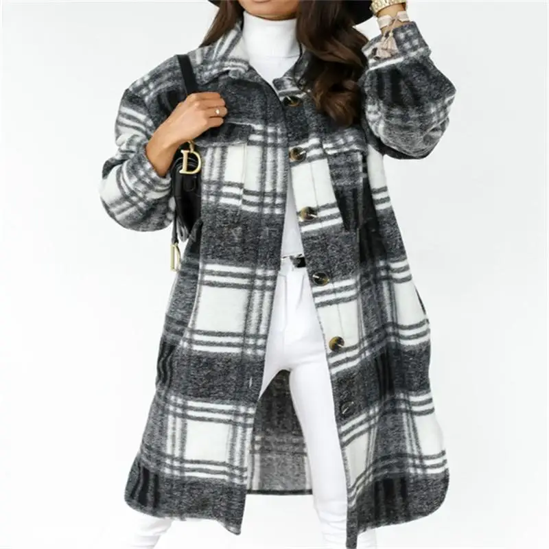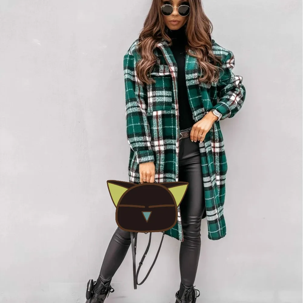 Женская ветрозащитная клетчатая куртка, Повседневная Длинная шерстя...