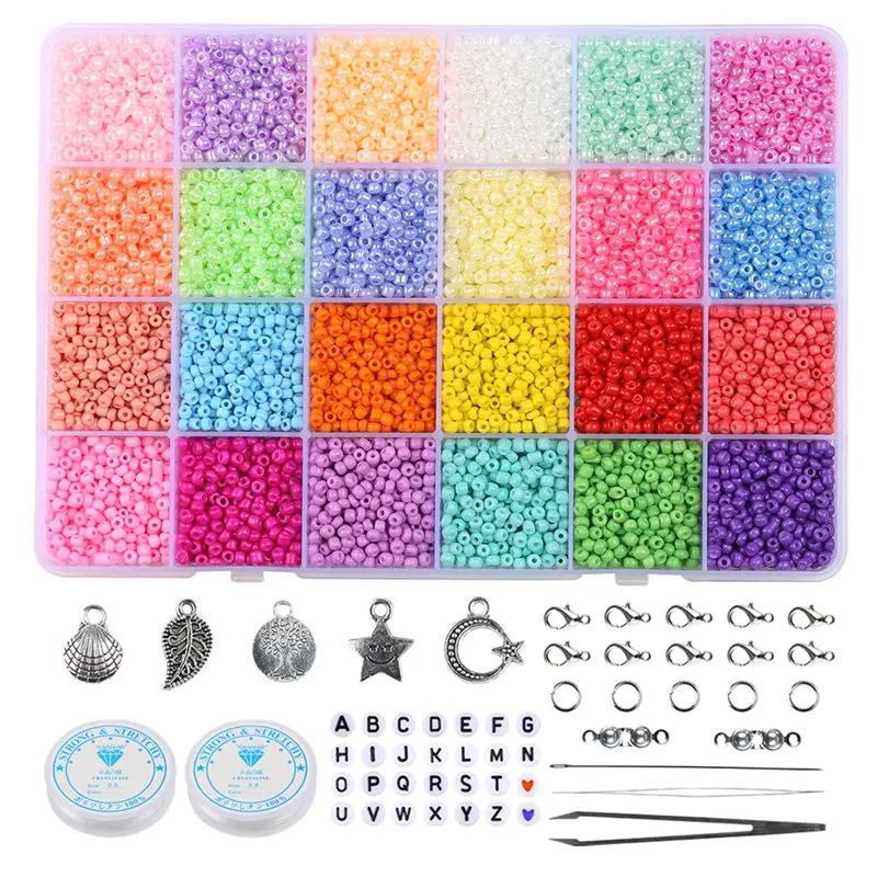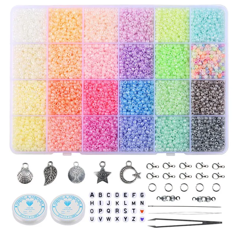 1 * стеклянные бусины в коробке270 * бусины с буквами5 * ювелирные подвески50 * Открытые Кольца для прыжков10 * застежка-лобстер50 * Соединительная застежка2 * эластичная веревка и 1 * леска2 * ведущий провод1 * пинцет