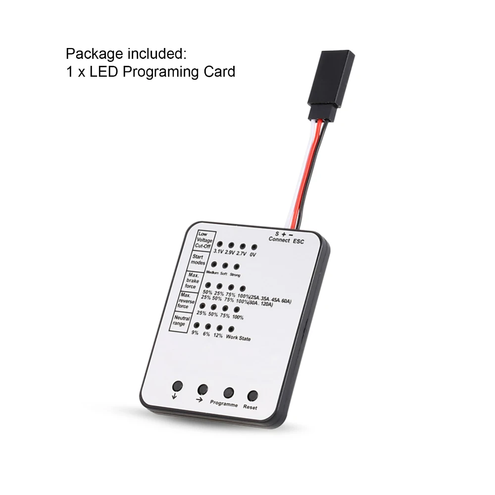 Особенности:1. Подходит для 25/35/45/60/80/120A ESC.2. Эта программная карта проста в использовании.3. Он может программировать тормозную силу, обратную силу, низковольтную защиту, режим запуска и нейтральный диапазон.Описание:Простая работа, подходит для различных esc, является хорошим выбором для RC вентиляторов.