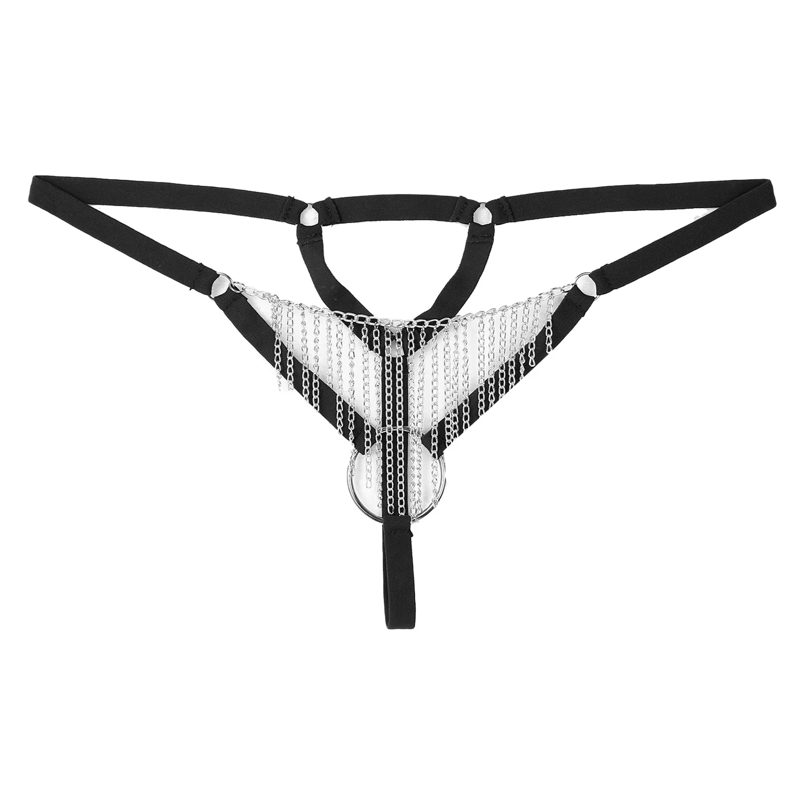 Нижнее белье, мужские трусы с мешочком, Т-образные стринги с бахромой и Т-образным ремешком, нижнее белье с металлической цепочкой и кисточками, кружевные подштанники