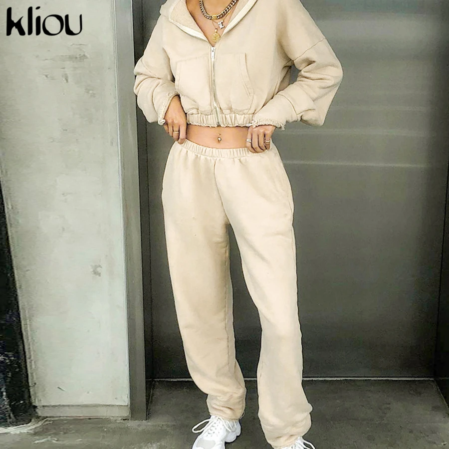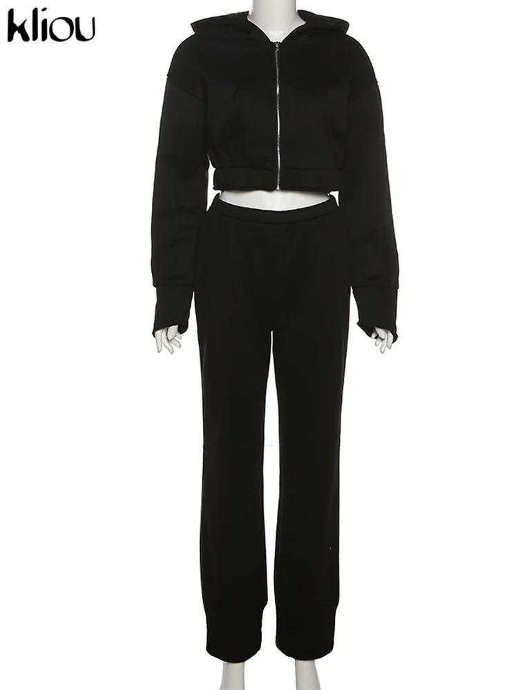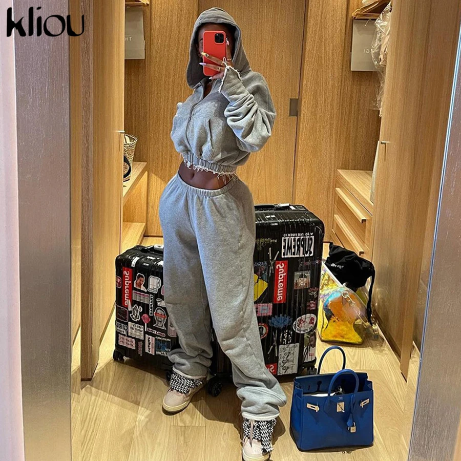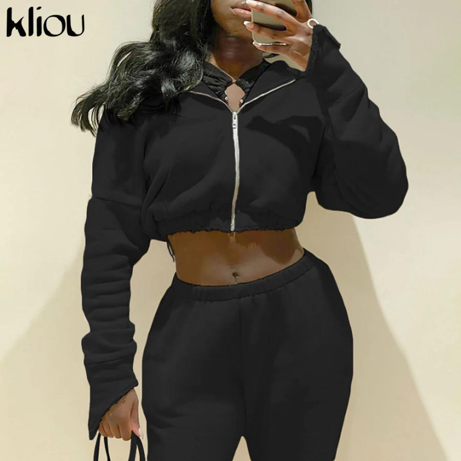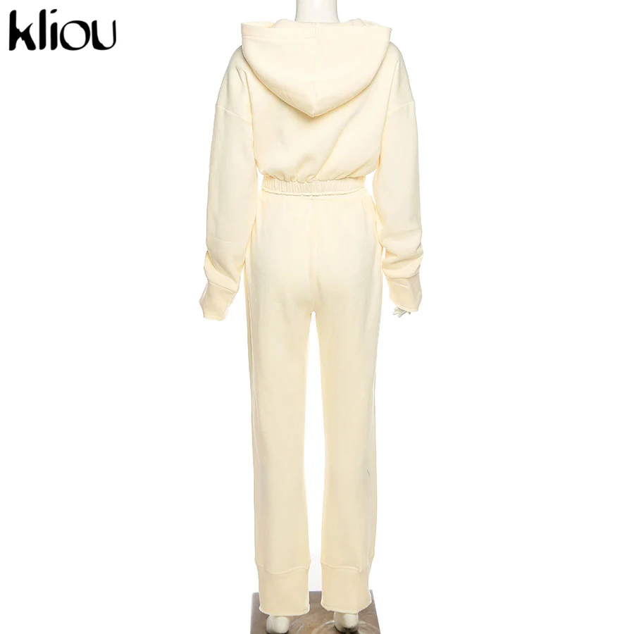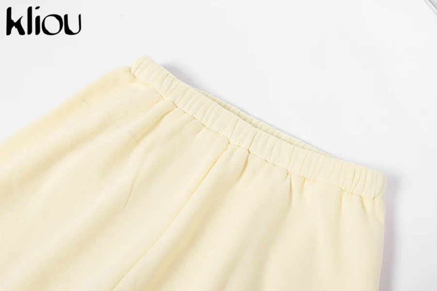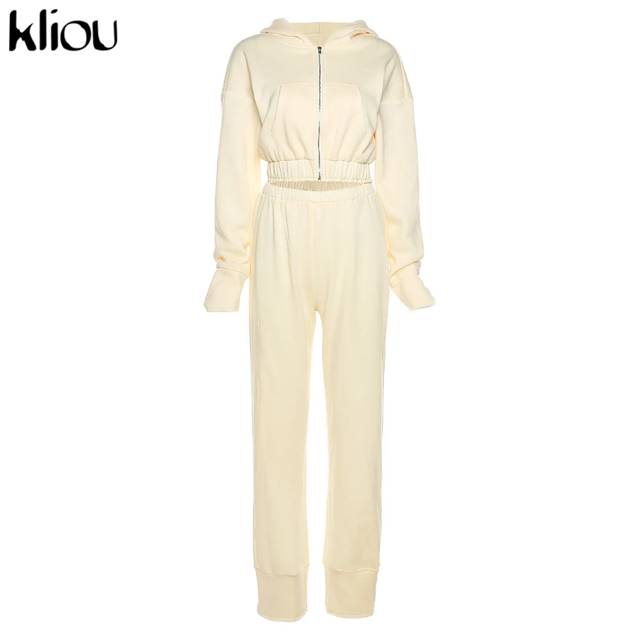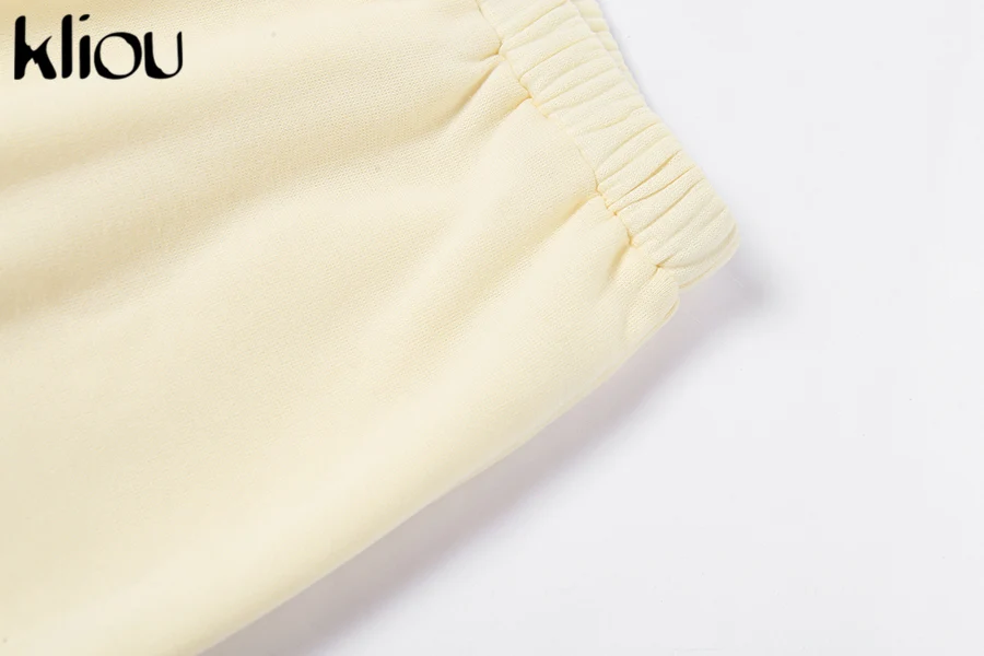 Kliou новый осенний комплект из двух предметов для женщин Harajuku Однотонная повседневная обувь Простые неправильной формы манжеты комплект: топ с капюшоном + спортивные штаны для активных занятий, эластичная женская одежда