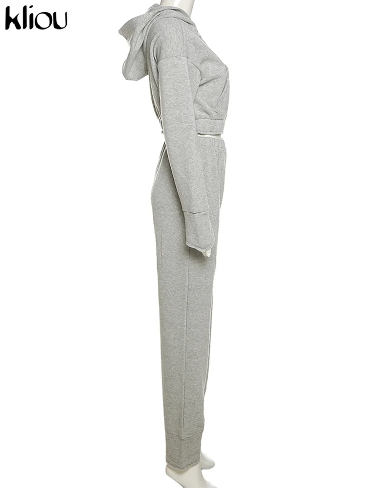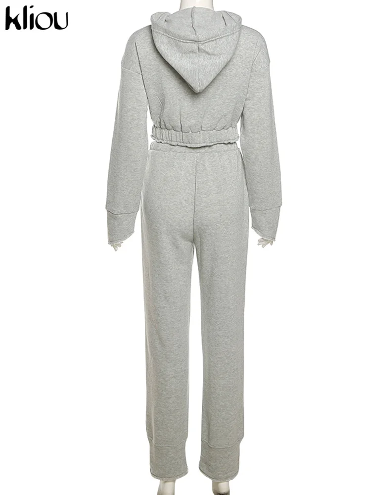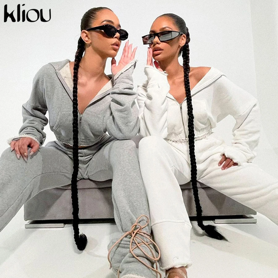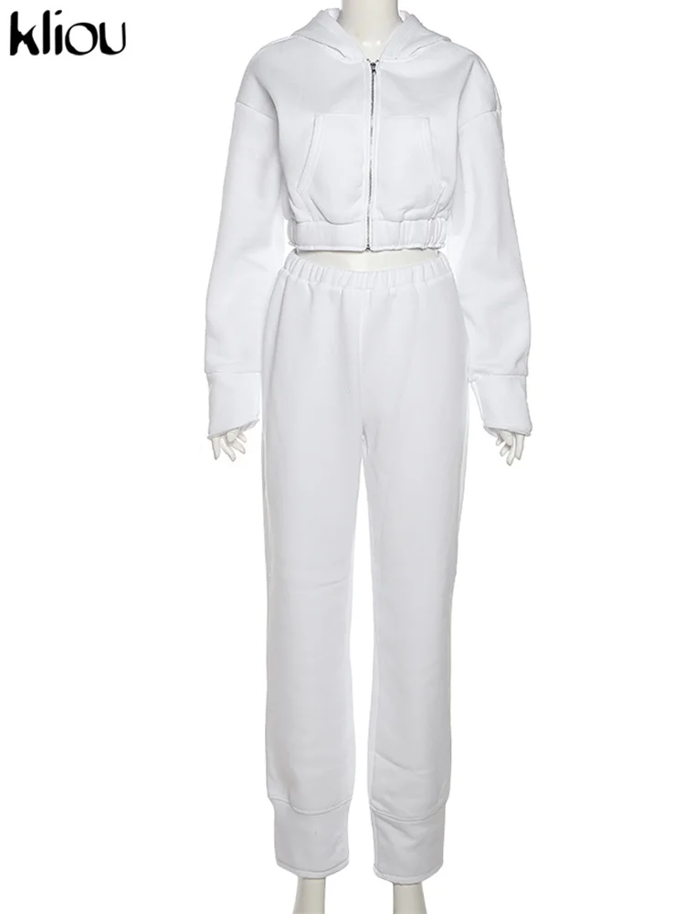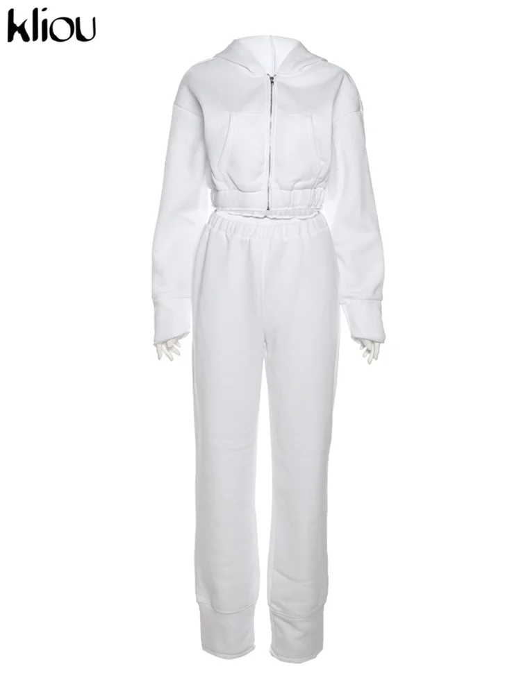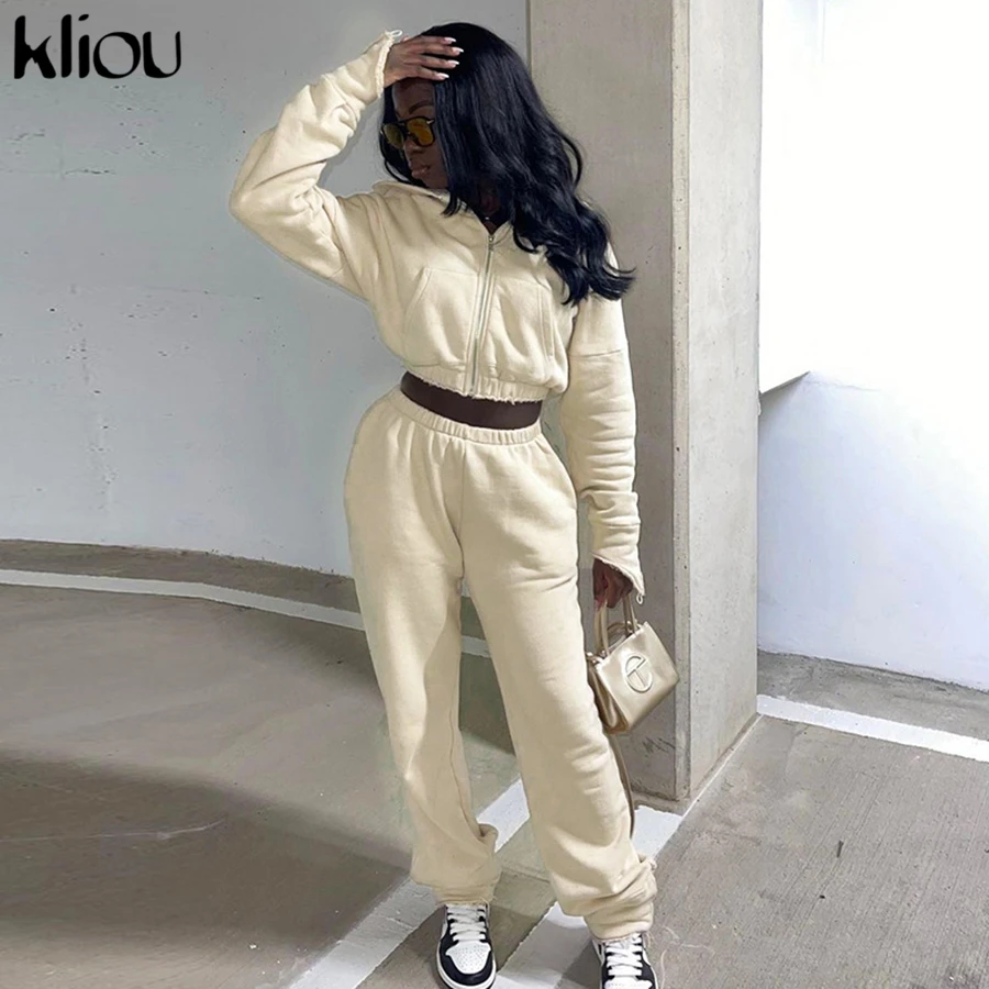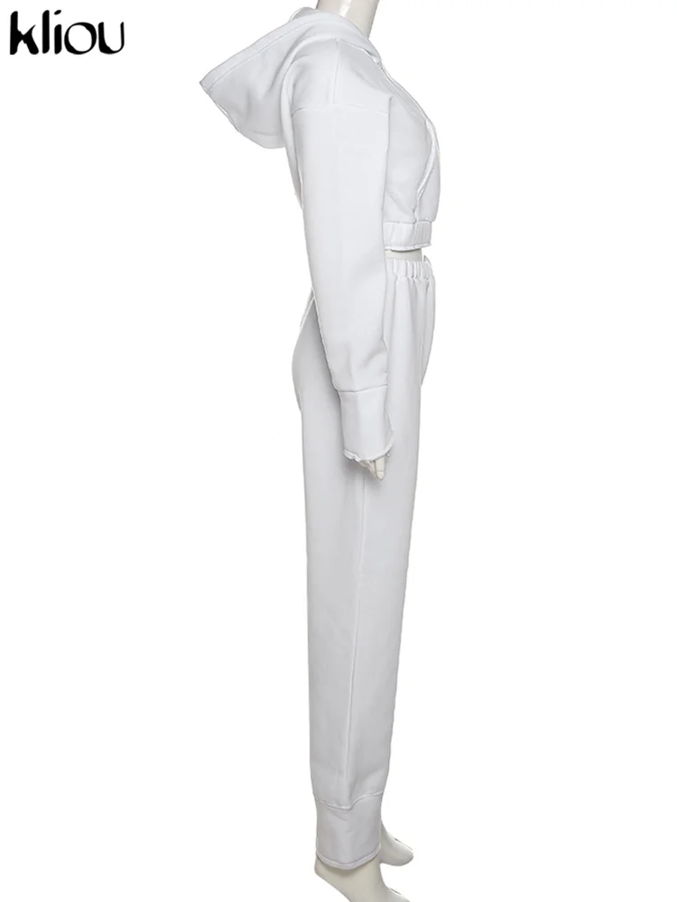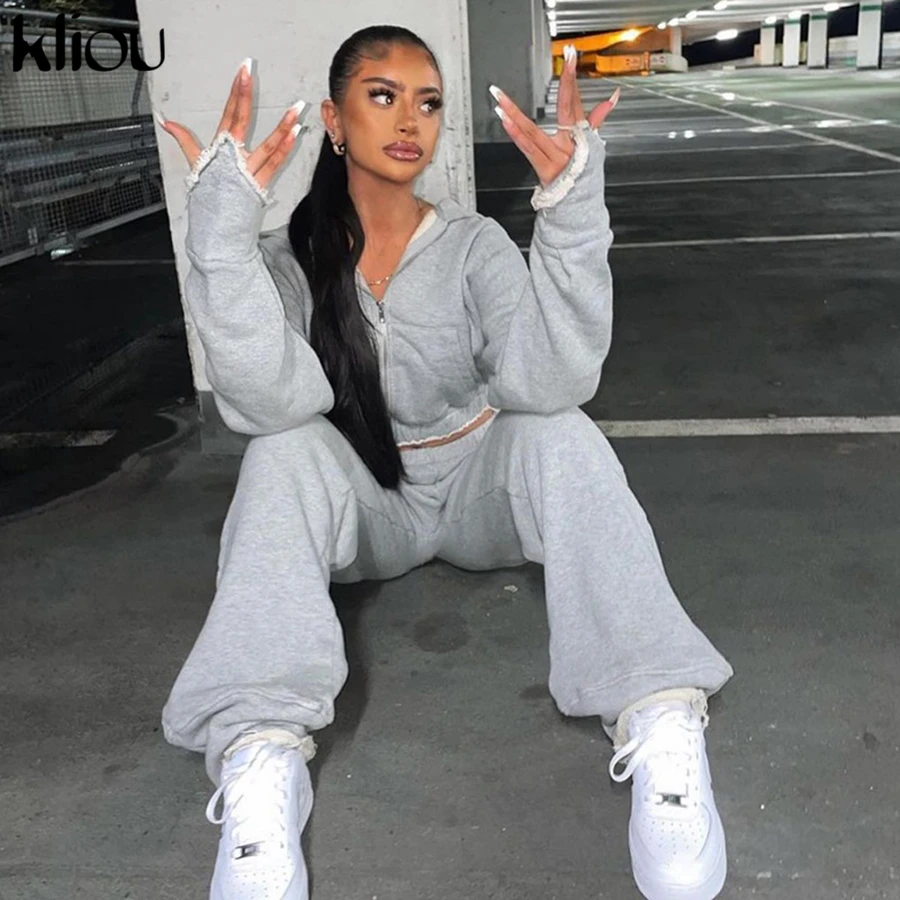 Kliou новый осенний комплект из двух предметов для женщин Harajuku Однотонная повседневная обувь Простые неправильной формы манжеты комплект: топ с капюшоном + спортивные штаны для активных занятий, эластичная женская одежда