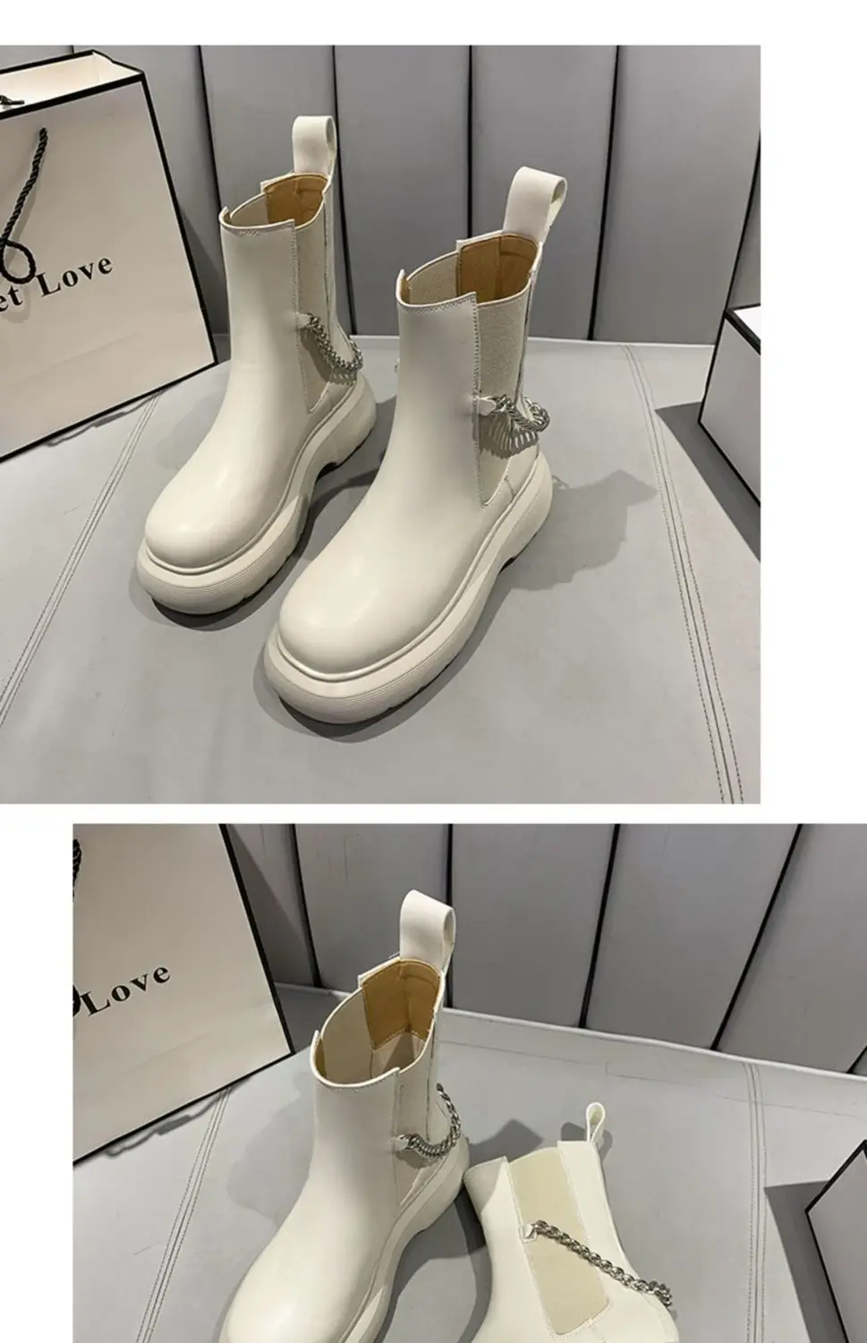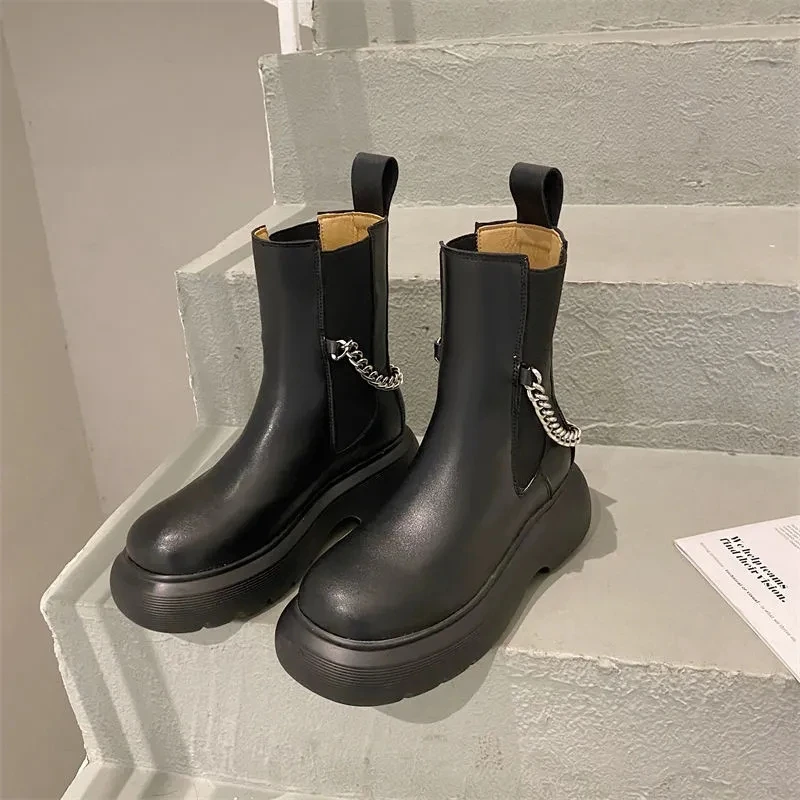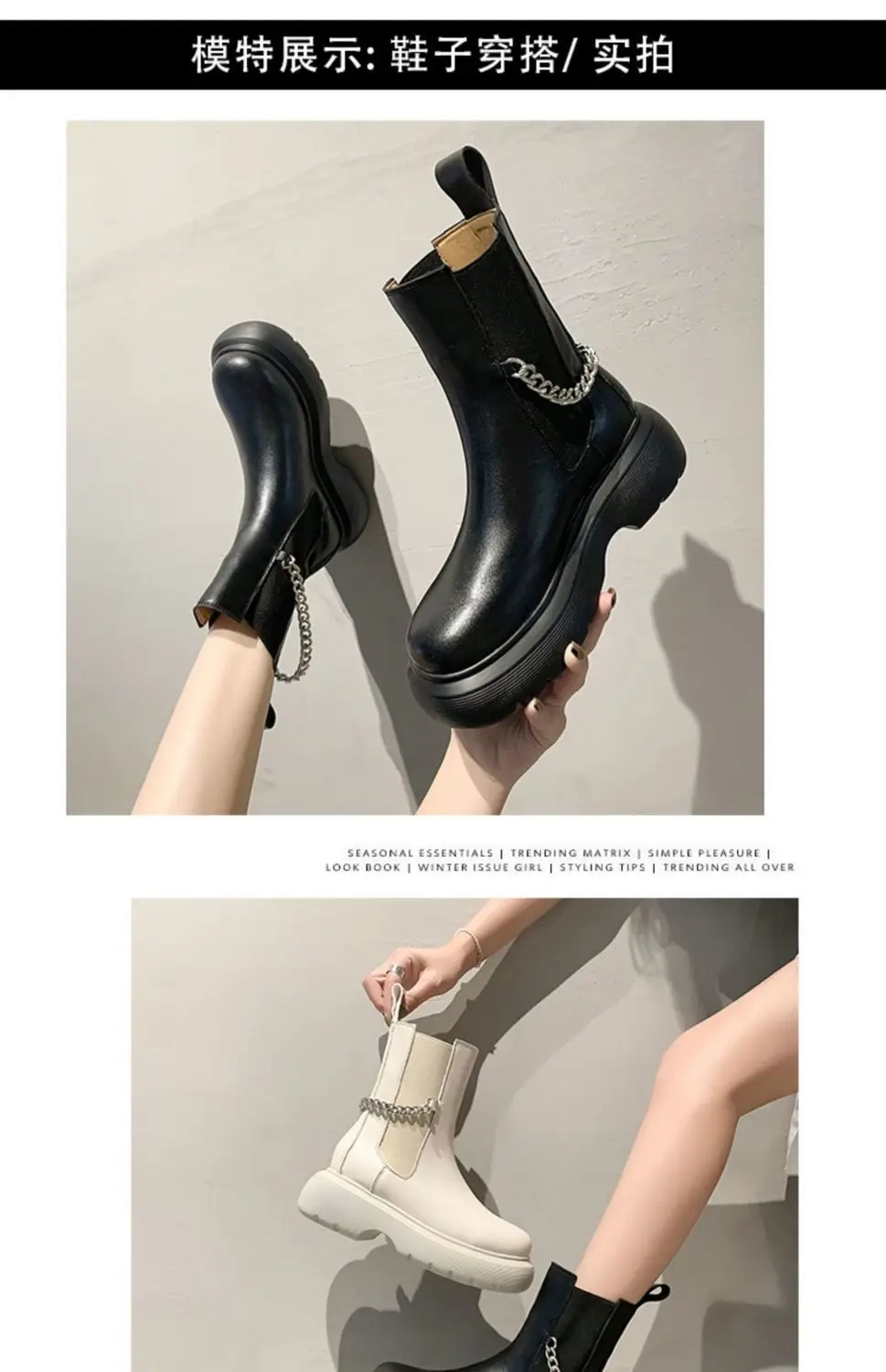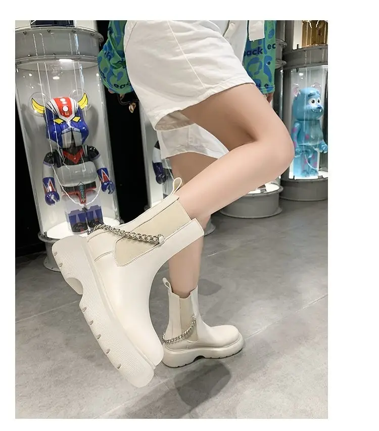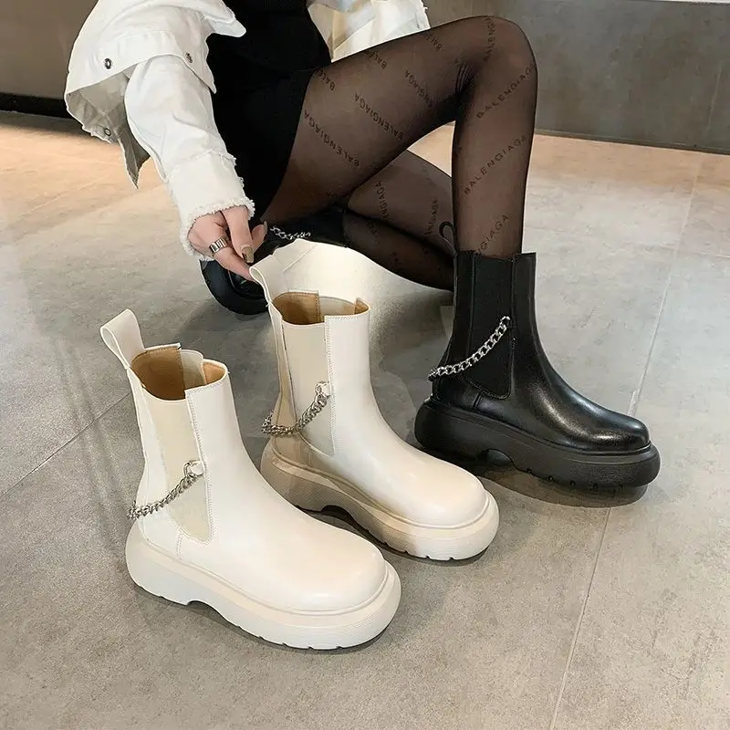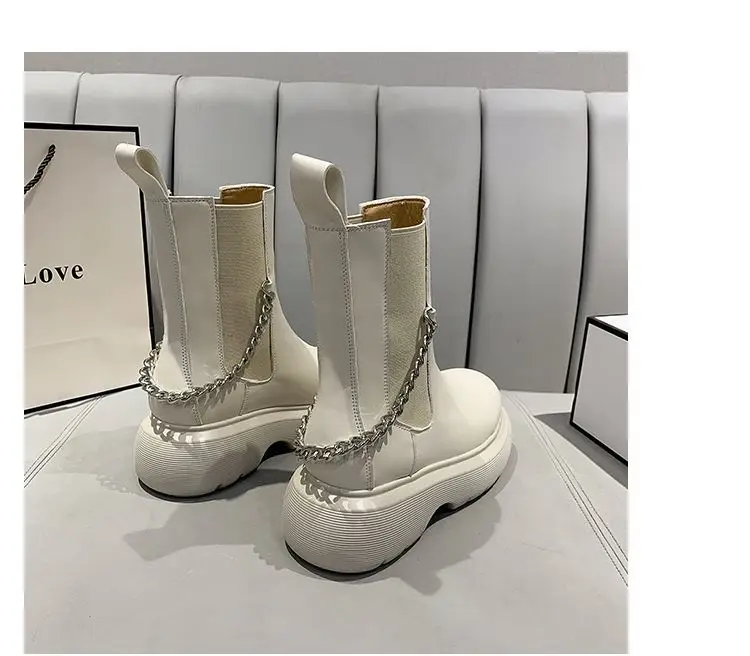 Женские кожаные ботинки челси QWEEK, черные и белые ботинки до середины икры, на платформе, на резиновой подошве, удобные, Осень-зима, 2021