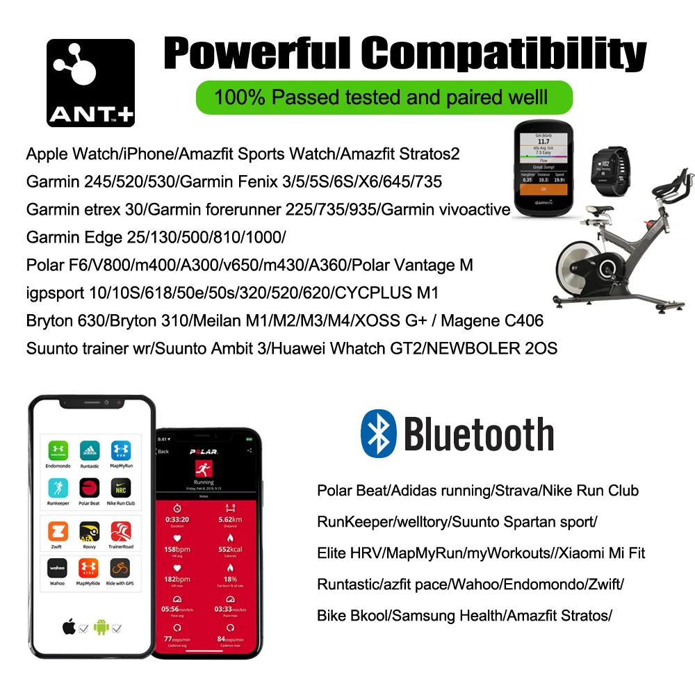 Совместимость с устройствами ant +, такими какЧасы Garmin/компьютерный велосипедBrighton / IGPSORTZwift/onelap / x-fitnessTomtom / bkool / polar beatTacx и виртуальное программное обеспечение для обучения велосипедуТакже совместим с приложениями через Bluetooth, напримерSTRAVA / Nike +WAHOO фитнес/EndomondoRUNTASTICPRO / MOOFITСпортивный трекер/Беговая назадЧасы Suunto bluetooth