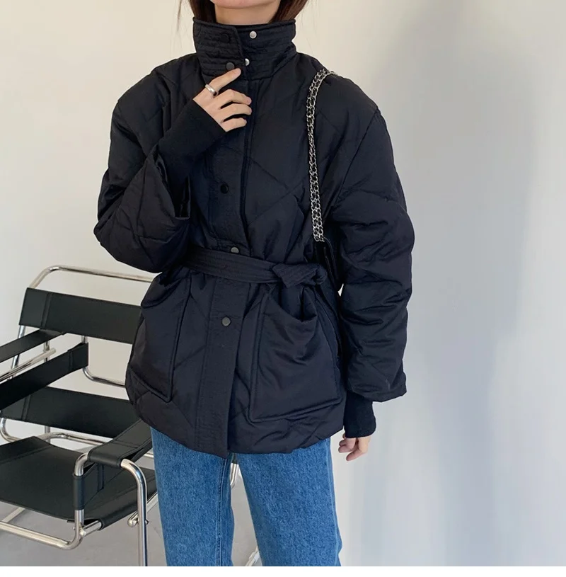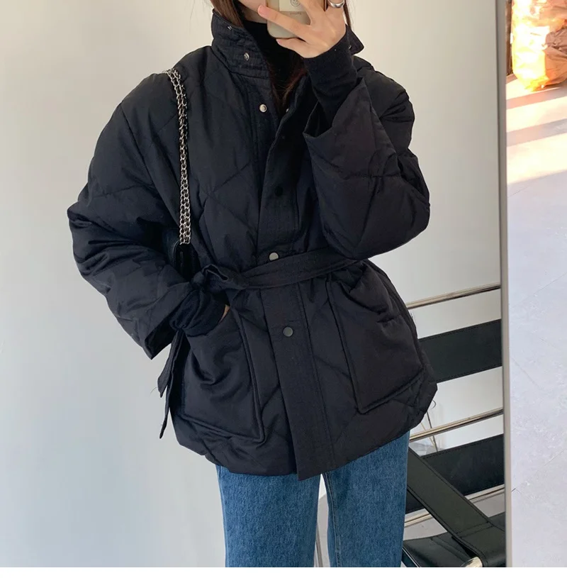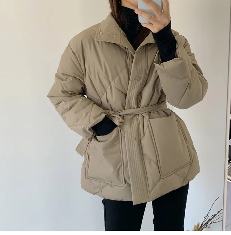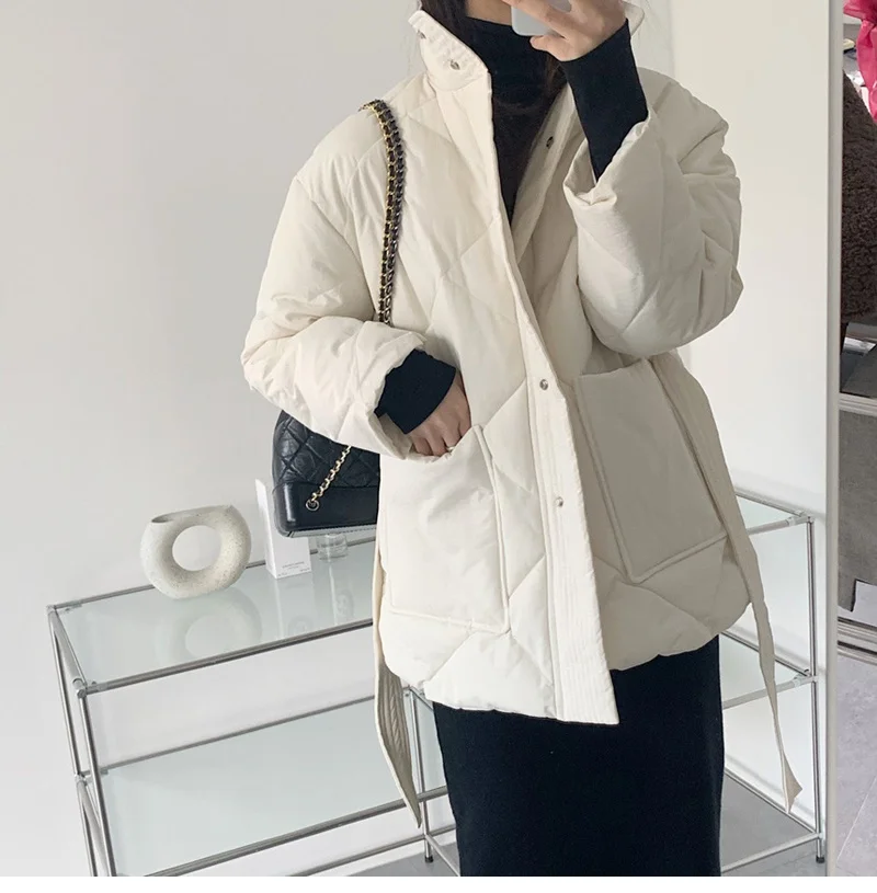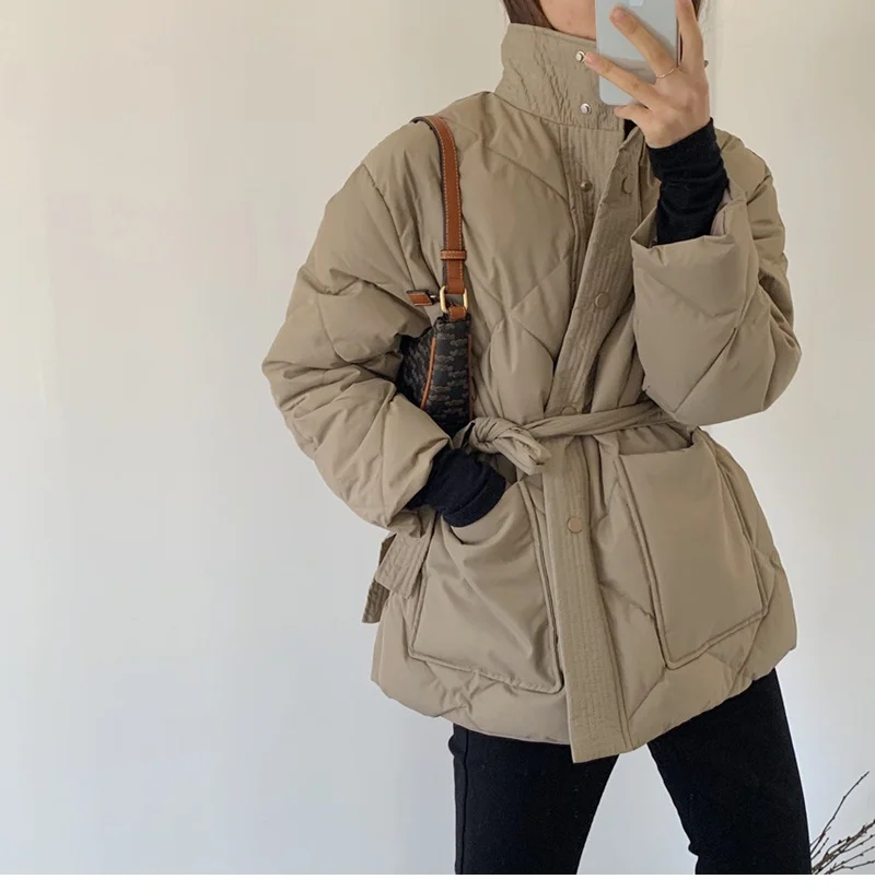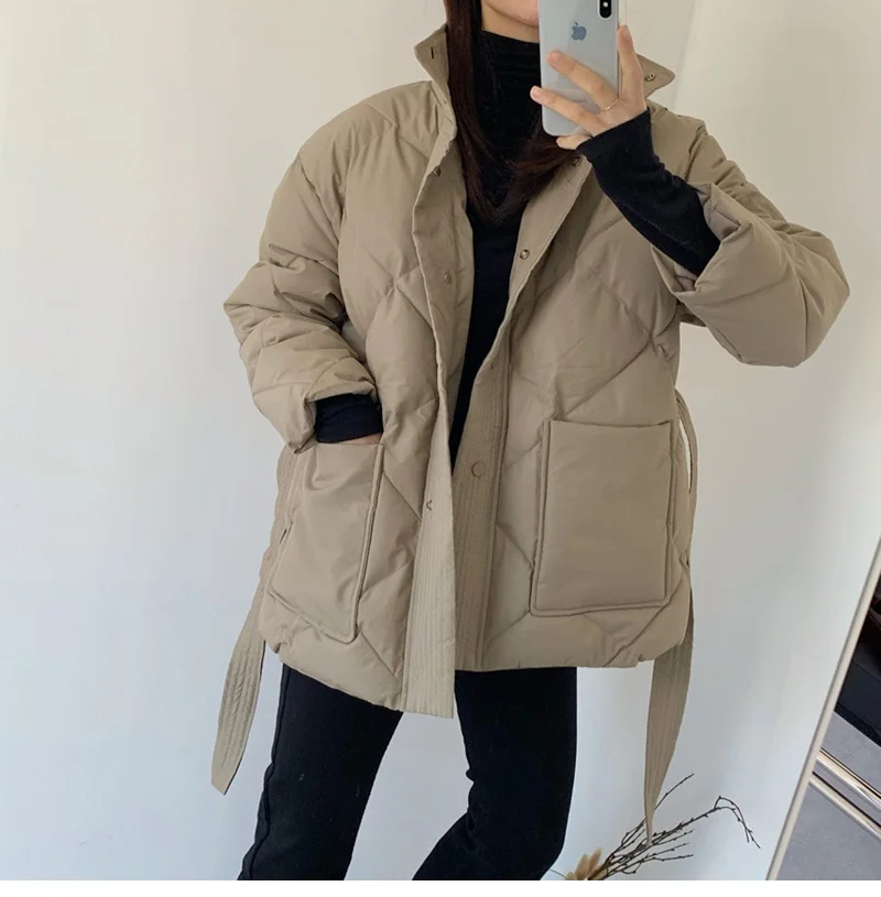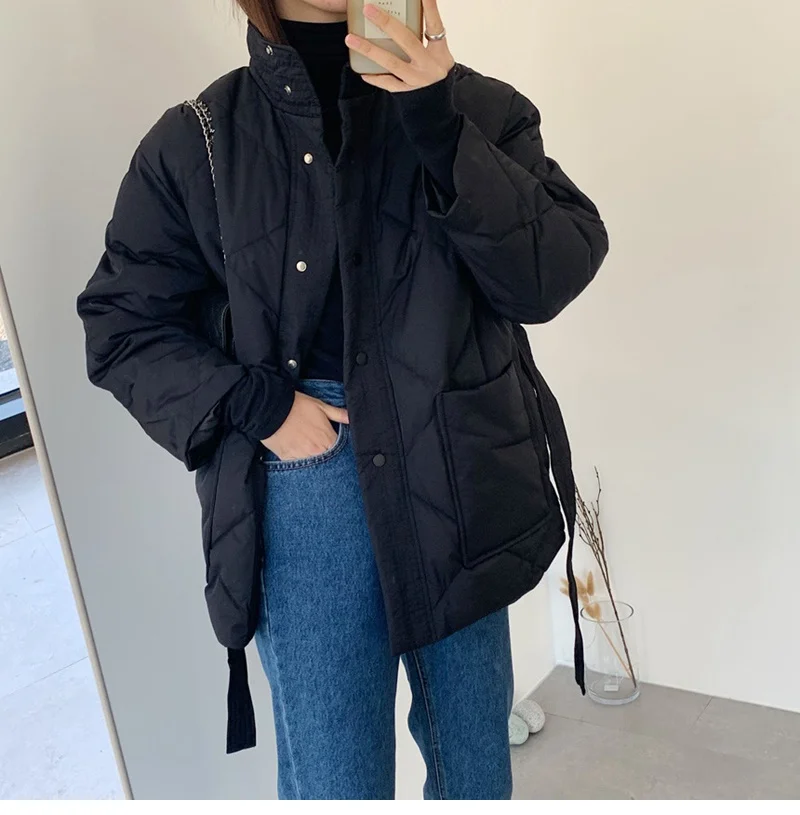 Женский пуховик с воротником-стойкой, однобортная однотонная парка большого размера на шнуровке с узором ромбиками, Осень-зима 2022