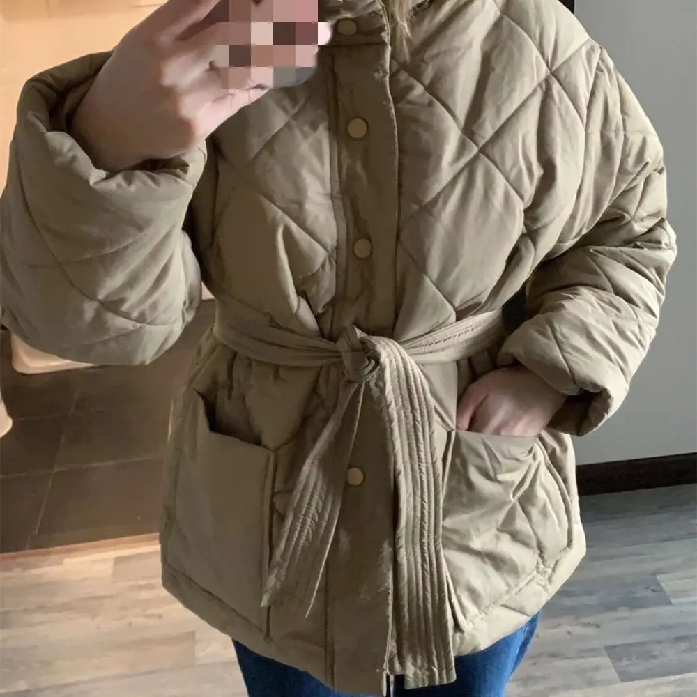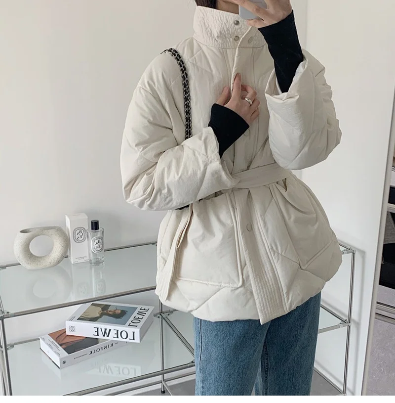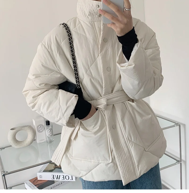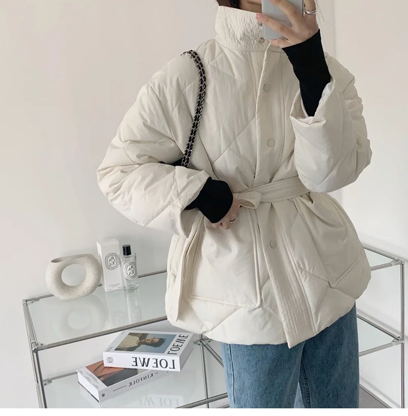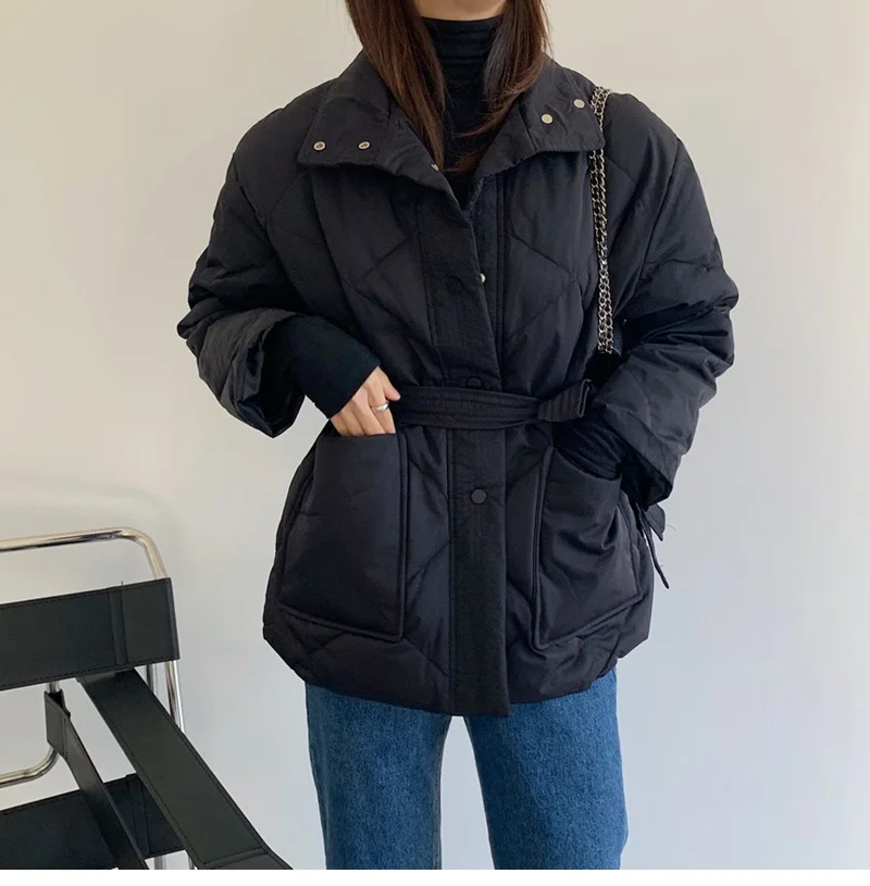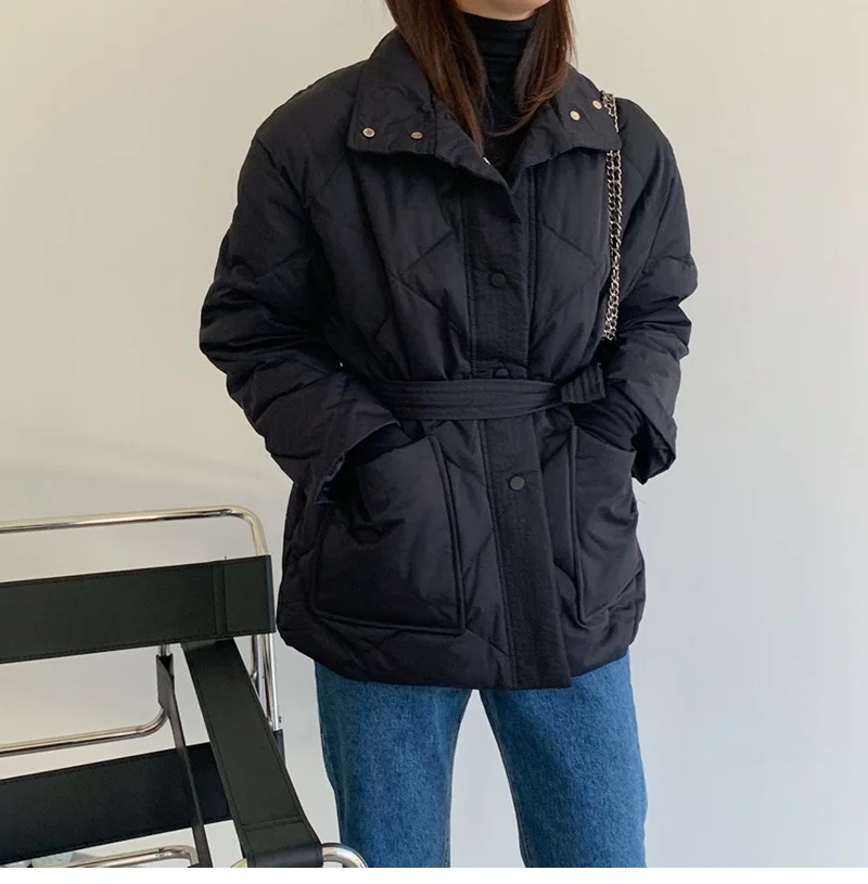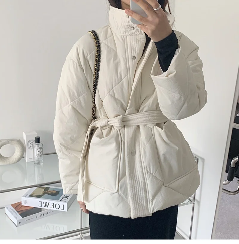 Женский пуховик с воротником-стойкой, однобортная однотонная парка большого размера на шнуровке с узором ромбиками, Осень-зима 2022