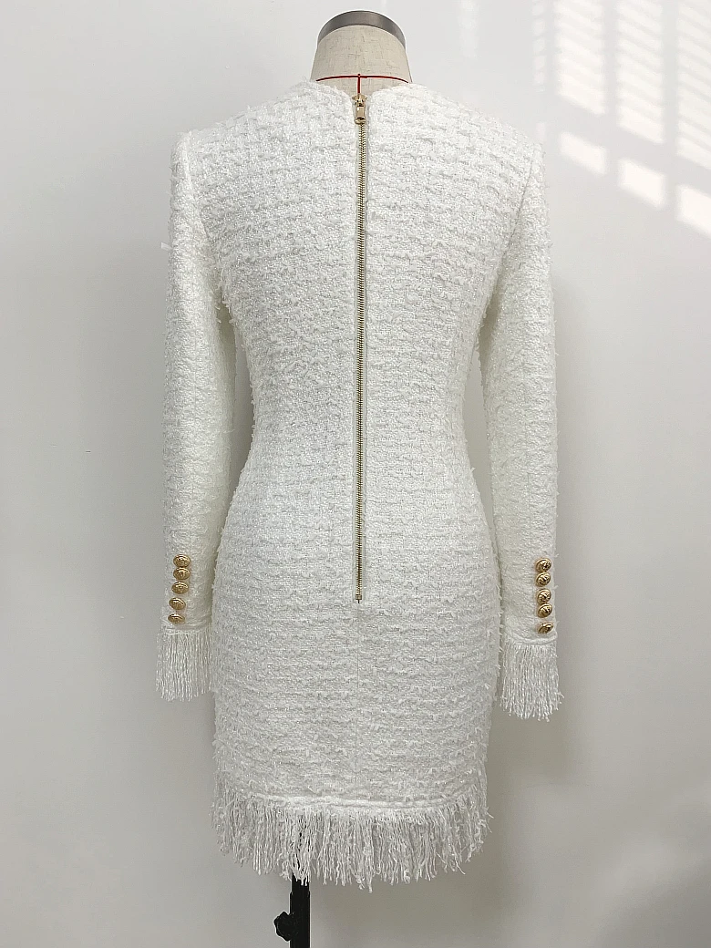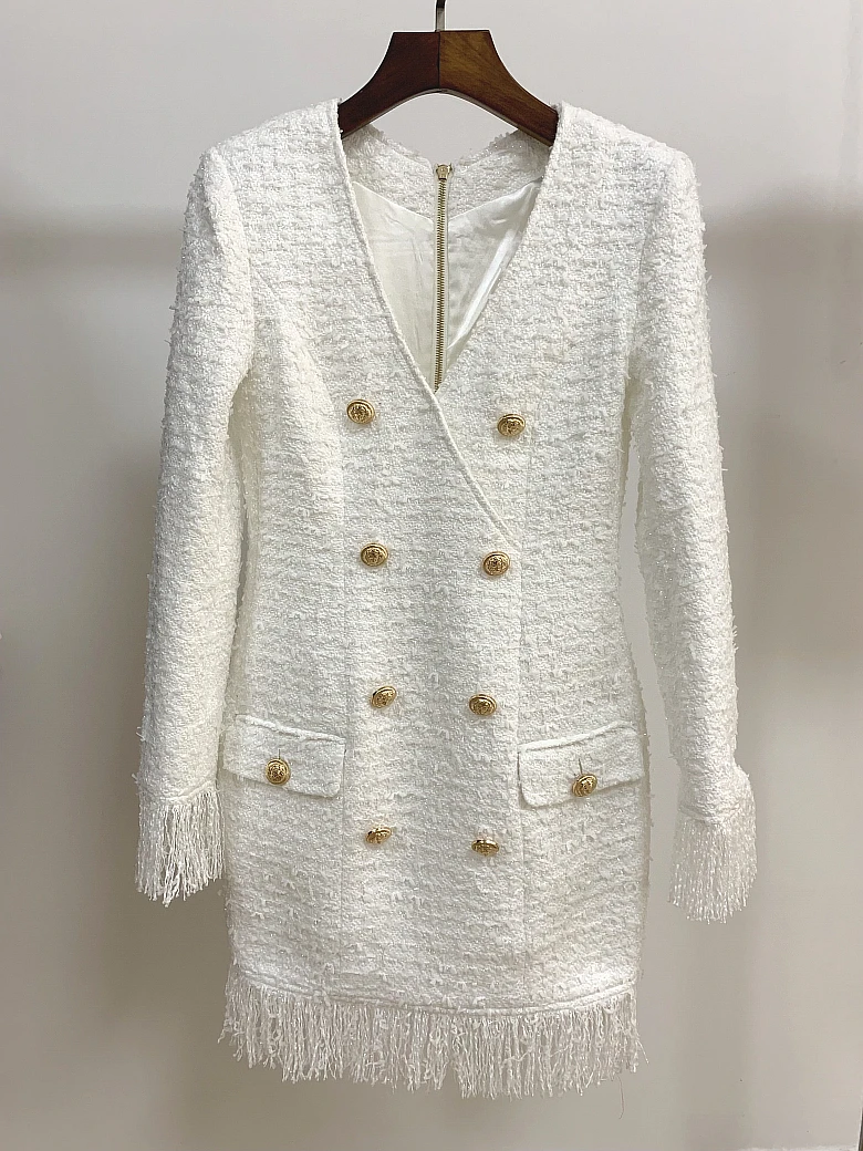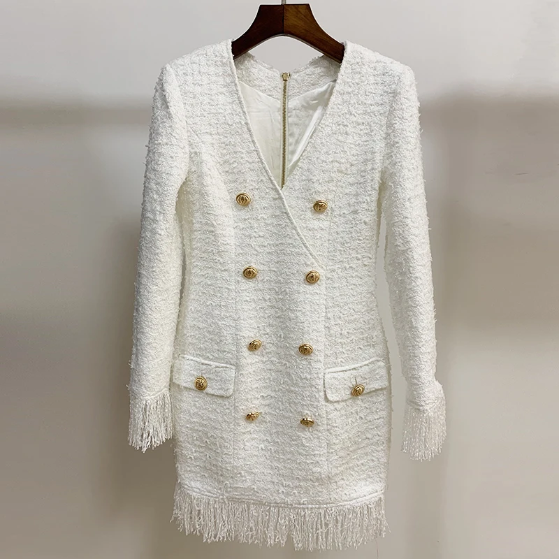 Женское твидовое платье с бахромой и кисточками, модельное дизайнерское платье с V-образным вырезом, пуговицами в виде льва, Осень-зима 2022