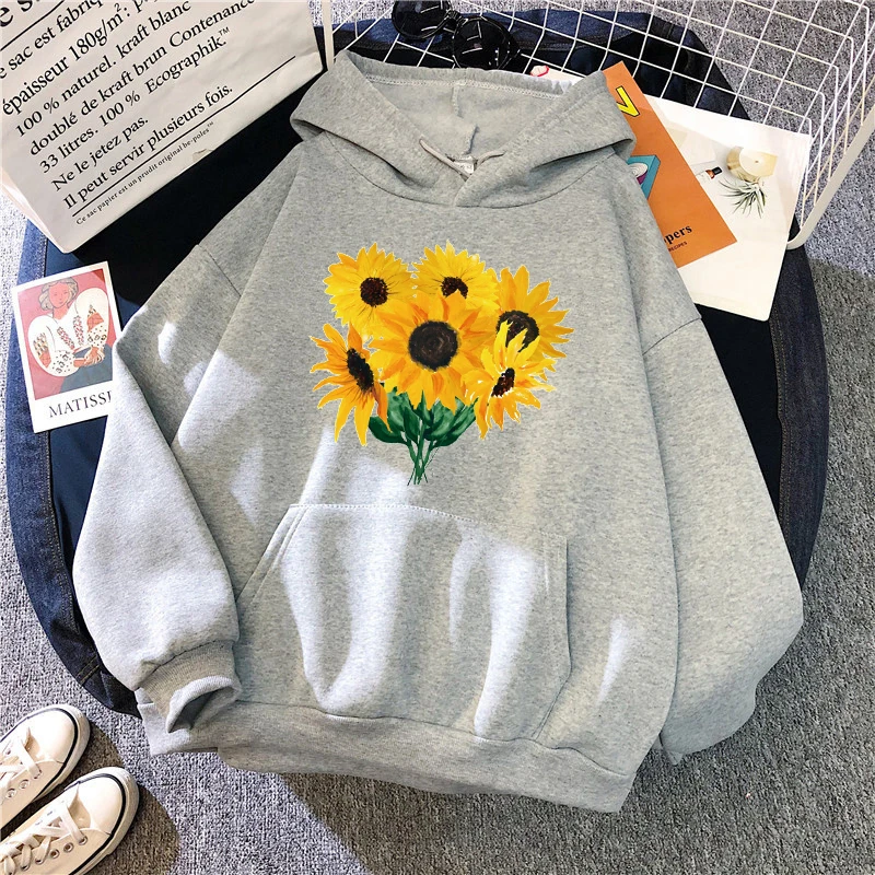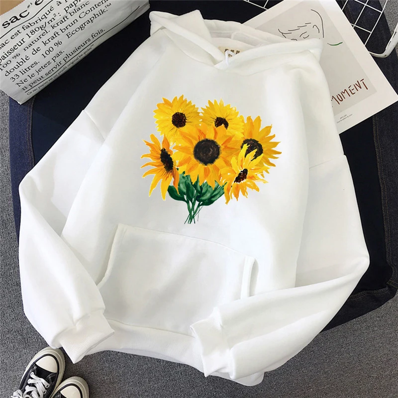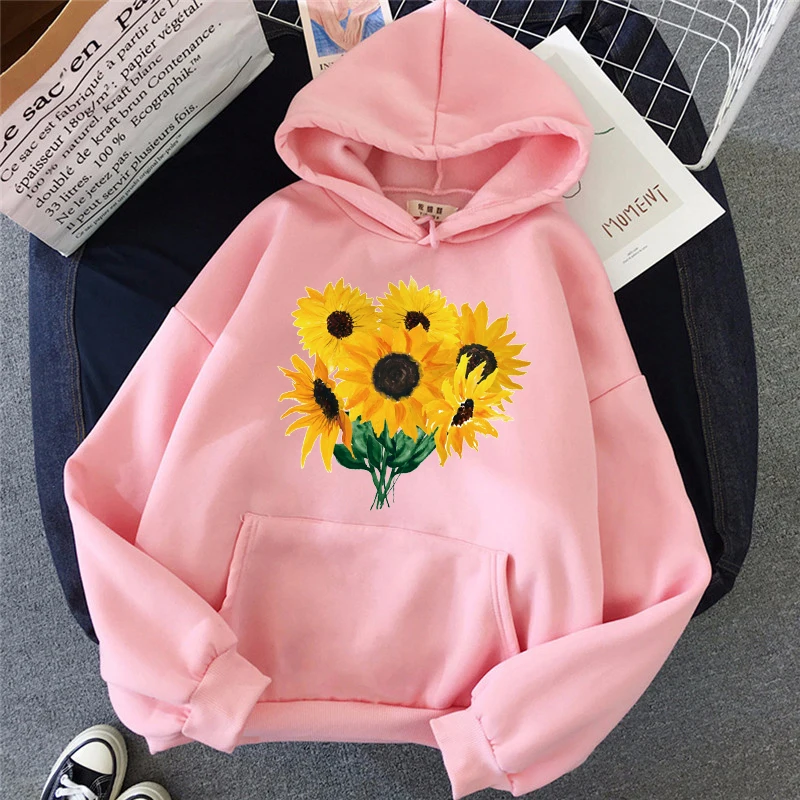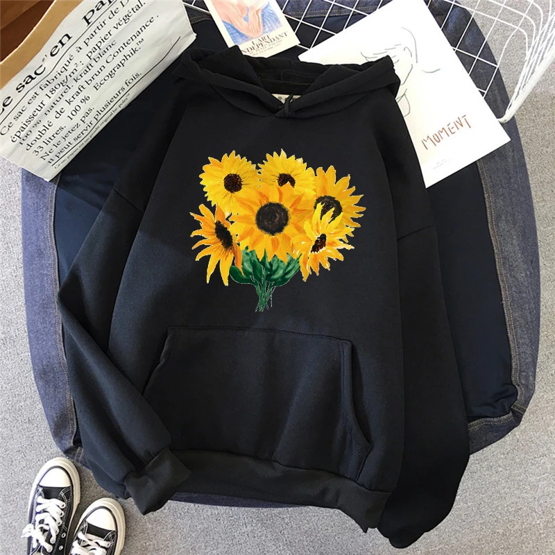 Осень 2021, Женская толстовка, простой свитер с мультяшным принтом подсолнуха, модный свободный ретро пуловер с длинным рукавом и карманами для мужчин
