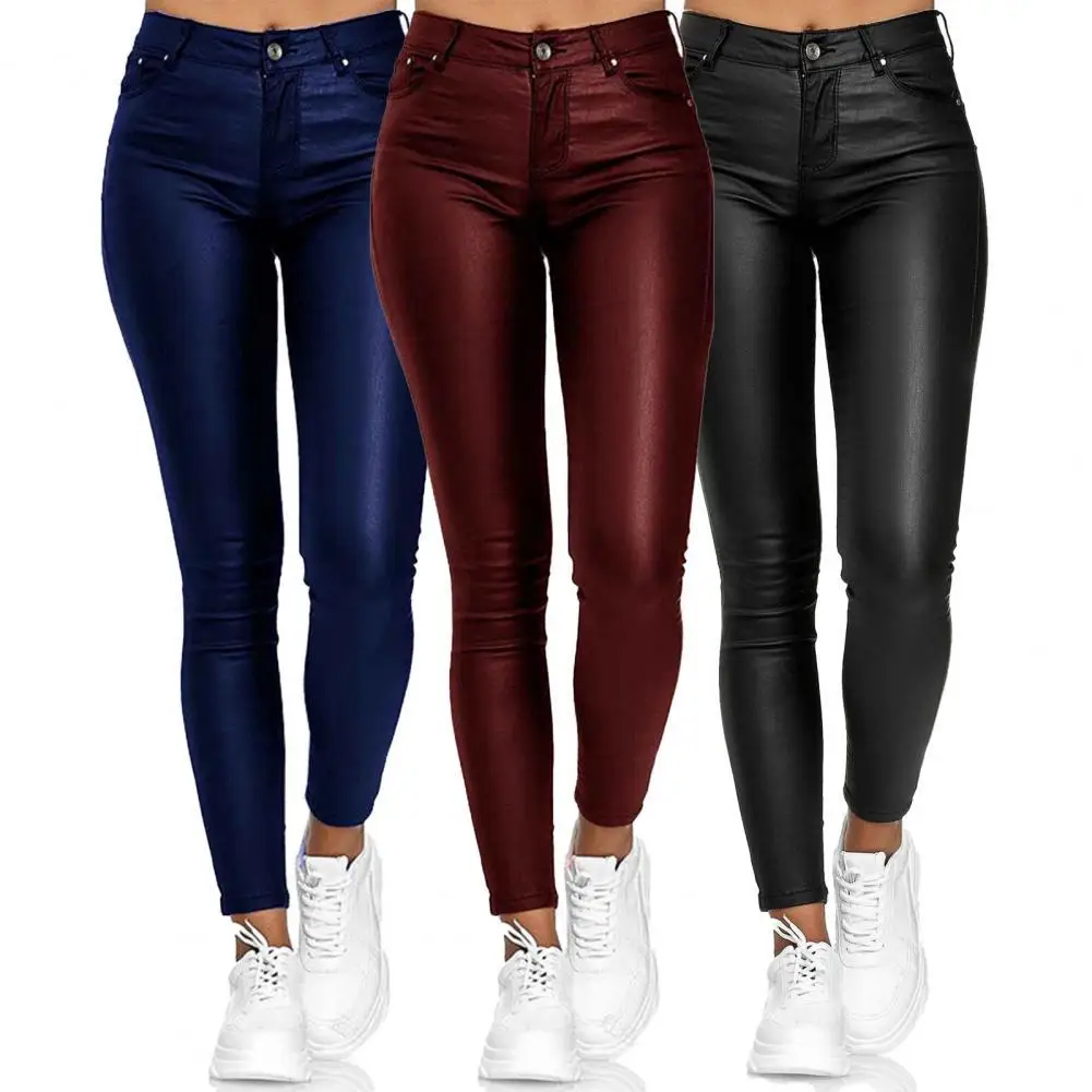 Брюки женские из искусственной кожи, эластичные, с высокой талией